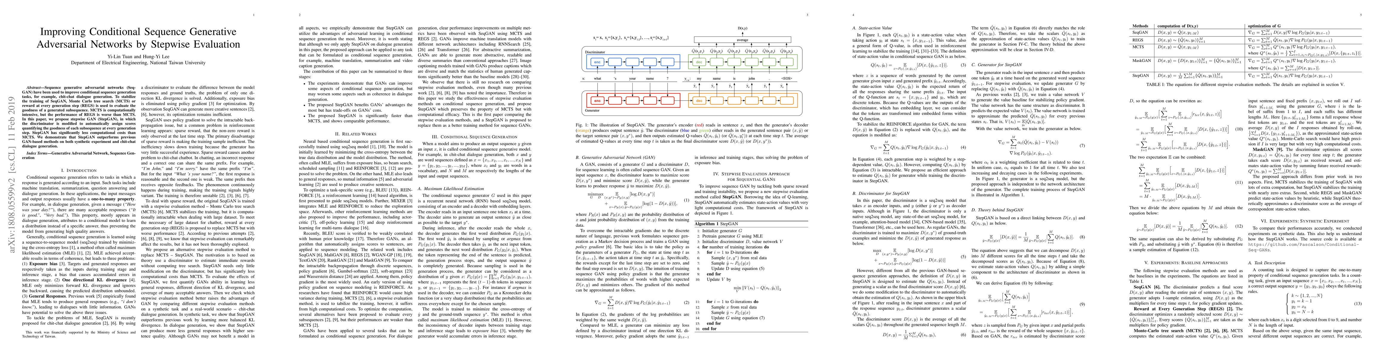 This paper proposes Stepwise GAN (StepGAN) to improve conditional sequence generative adversarial networks (SeqGAN) by evaluating the quality of generated sequences at each step, reducing computational costs compared to Monte Carlo tree search (MCTS) while outperforming previous methods in dialogue generation tasks.
