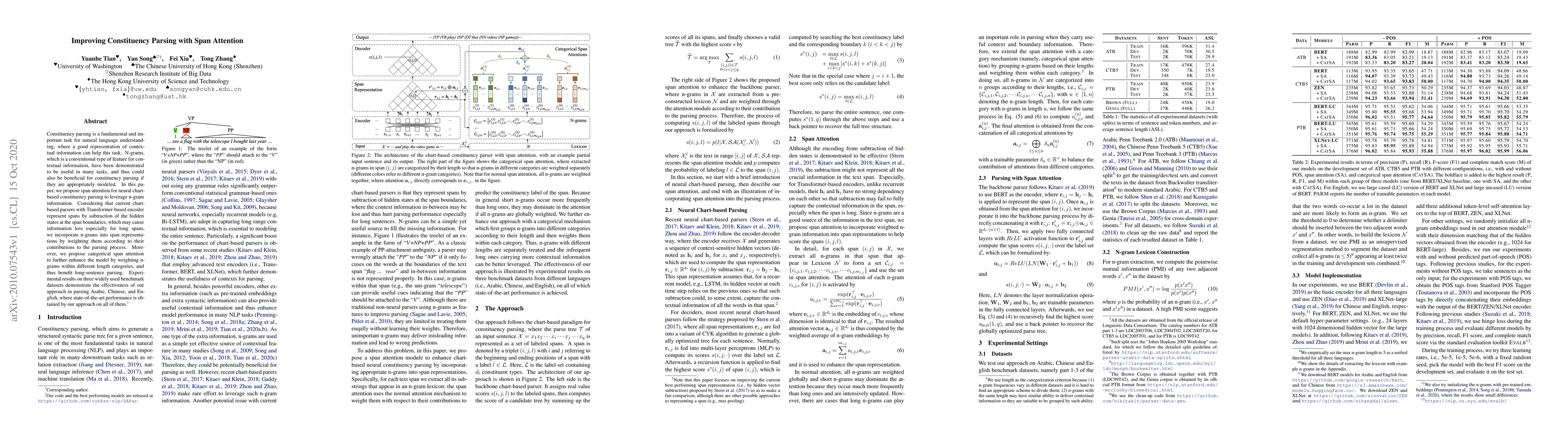 This paper proposes span attention for neural chart-based constituency parsing to utilize n-gram information, addressing information loss in current methods for long spans. The approach achieves state-of-the-art results on Arabic, Chinese, and English datasets.