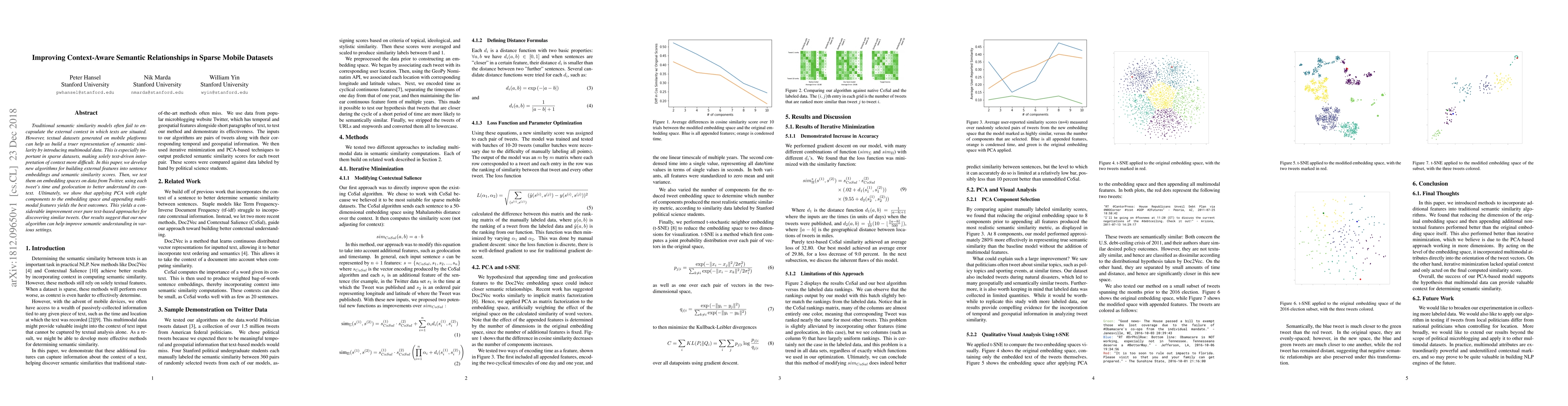 Traditional semantic similarity models often fail to encapsulate the external context in which texts are situated. However, textual datasets generated on mobile platforms can help us build a truer representation of semantic similarity by introducing multimodal data. This is especially important in sparse datasets, making solely text-driven interpretation of context more difficult. In this paper, we develop new algorithms for building external features into sentence embeddings and semantic similarity scores. Then, we test them on embedding spaces on data from Twitter, using each tweet's time and geolocation to better understand its context. Ultimately, we show that applying PCA with eight components to the embedding space and appending multimodal features yields the best outcomes. This yields a considerable improvement over pure text-based approaches for discovering similar tweets. Our results suggest that our new algorithm can help improve semantic understanding in various settings.