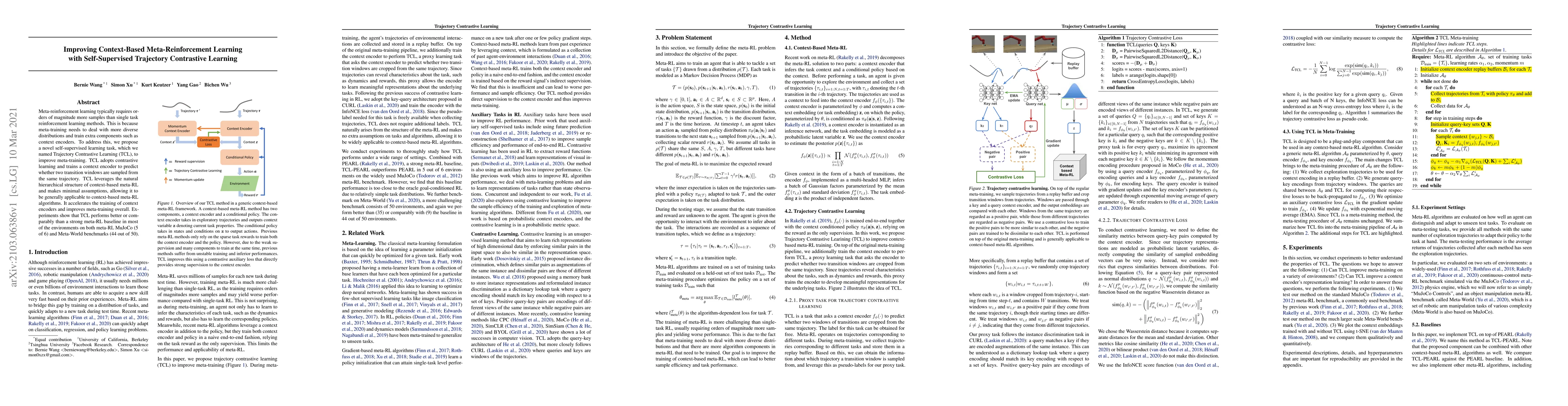 This paper proposes Trajectory Contrastive Learning (TCL), a self-supervised method to enhance meta-reinforcement learning by training context encoders through contrastive learning on trajectory segments. TCL accelerates meta-training and performs competitively compared to baselines across various environments.