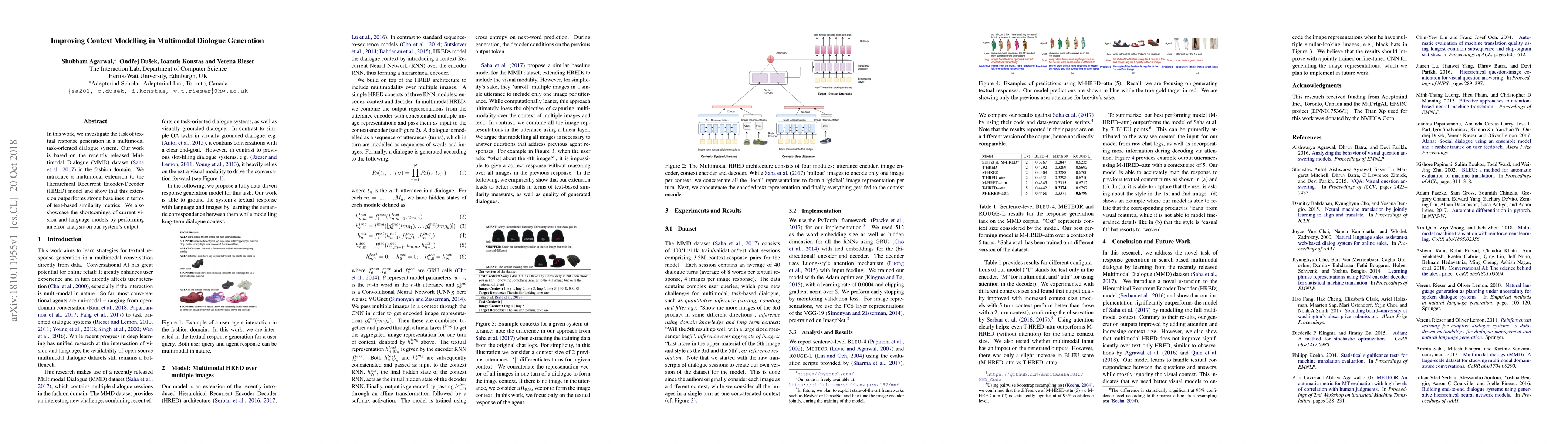 In this work, we investigate the task of textual response generation in a multimodal task-oriented dialogue system. Our work is based on the recently released Multimodal Dialogue (MMD) dataset (Saha et al., 2017) in the fashion domain. We introduce a multimodal extension to the Hierarchical Recurrent Encoder-Decoder (HRED) model and show that this extension outperforms strong baselines in terms of text-based similarity metrics. We also showcase the shortcomings of current vision and language models by performing an error analysis on our system's output.