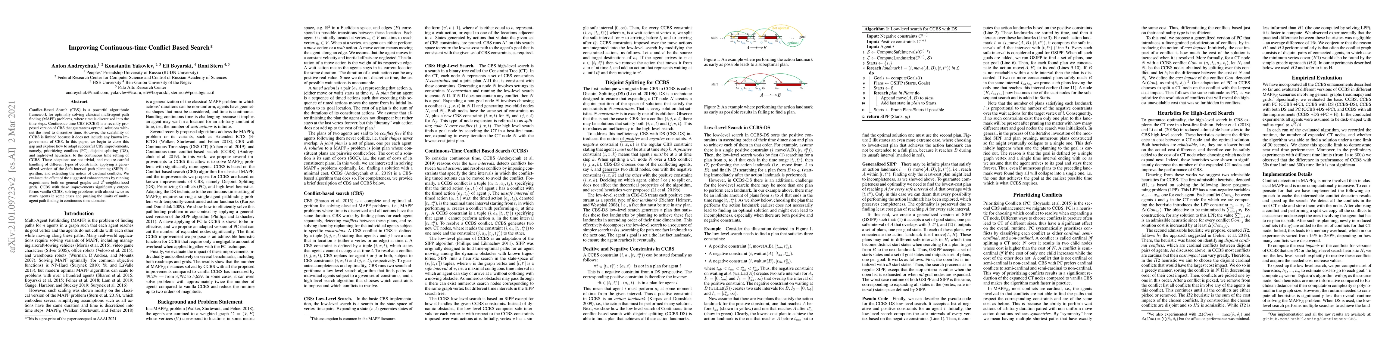 This paper improves Continuous-time Conflict-Based Search (CCBS) for solving multi-agent path finding problems in continuous time, achieving better performance than vanilla CCBS through adaptations of prioritizing conflicts, disjoint splitting, and high-level heuristics.