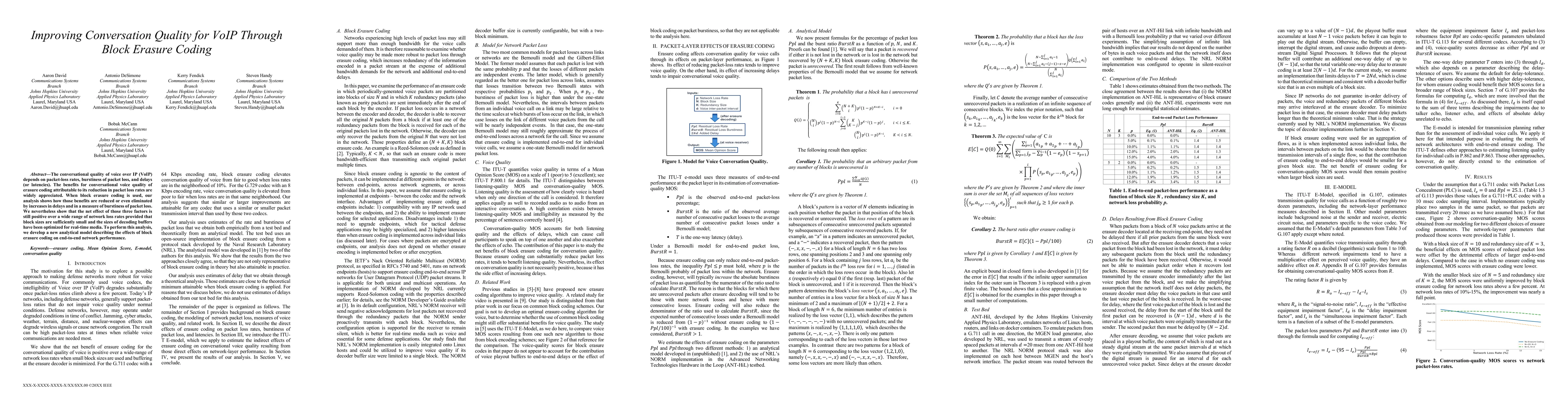 This paper analyzes how block erasure coding improves VoIP conversation quality by reducing packet loss, despite increased delays and burstiness. It concludes that small block sizes and optimized decoding buffers can maintain positive effects over various network loss rates.