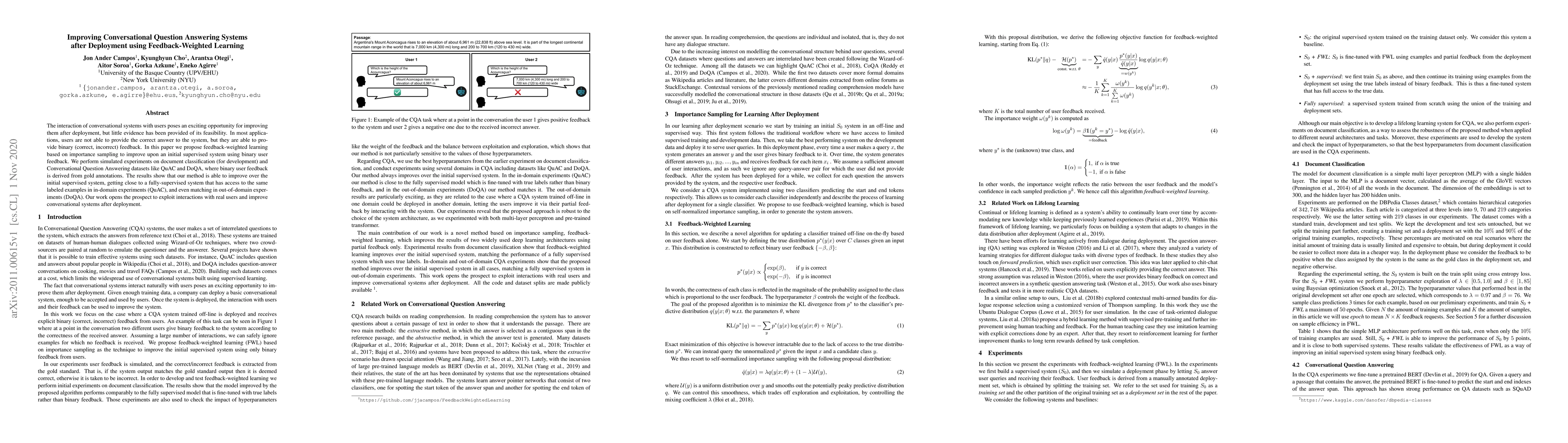 This paper proposes a feedback-weighted learning method using importance sampling to enhance conversational question answering systems post-deployment, leveraging binary user feedback. Experiments on QuAC and DoQA datasets show significant improvements over initial supervised systems, demonstrating the potential of real-user interactions for system enhancement.