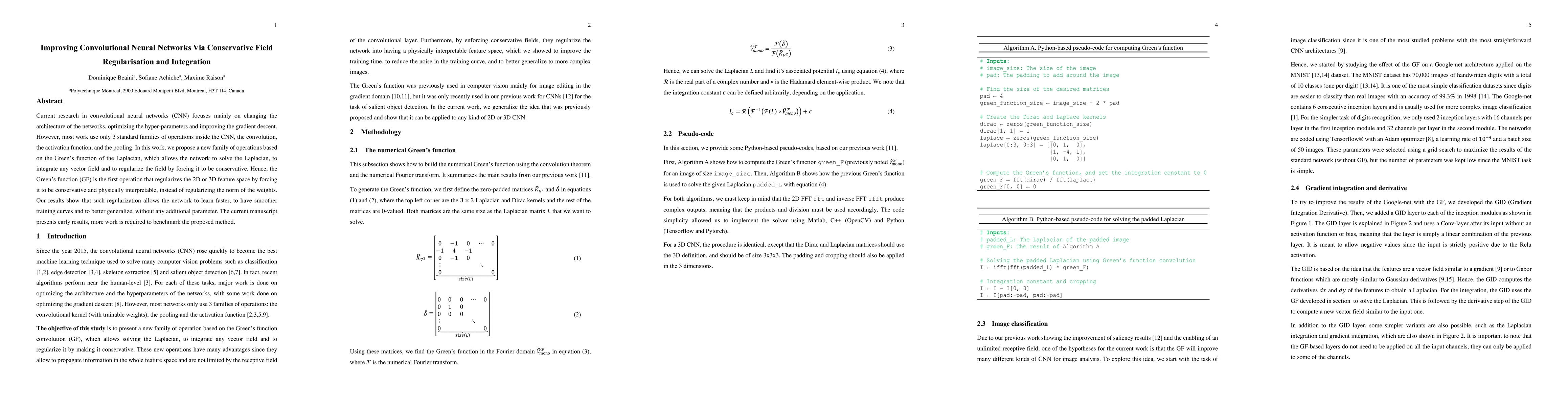 Current research in convolutional neural networks (CNN) focuses mainly on changing the architecture of the networks, optimizing the hyper-parameters and improving the gradient descent. However, most work use only 3 standard families of operations inside the CNN, the convolution, the activation function, and the pooling. In this work, we propose a new family of operations based on the Green's function of the Laplacian, which allows the network to solve the Laplacian, to integrate any vector field and to regularize the field by forcing it to be conservative. Hence, the Green's function (GF) is the first operation that regularizes the 2D or 3D feature space by forcing it to be conservative and physically interpretable, instead of regularizing the norm of the weights. Our results show that such regularization allows the network to learn faster, to have smoother training curves and to better generalize, without any additional parameter. The current manuscript presents early results, more work is required to benchmark the proposed method.