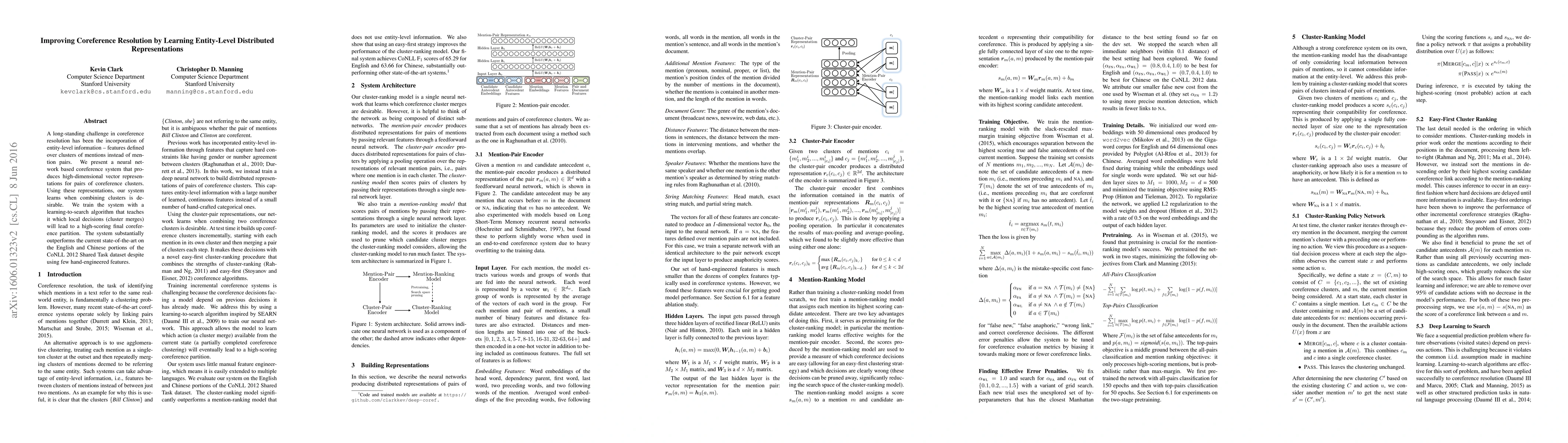 This paper introduces a neural network-based coreference resolution system that leverages high-dimensional vector representations for coreference clusters to improve resolution accuracy. The system uses a learning-to-search algorithm to optimize local decisions, achieving state-of-the-art results on English and Chinese datasets with minimal hand-engineered features.