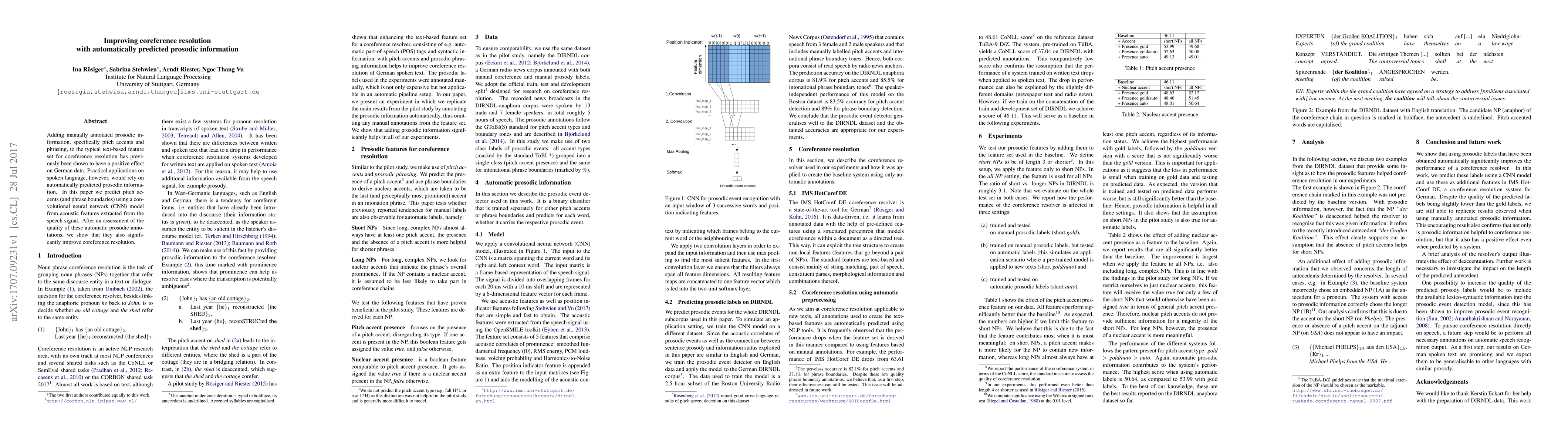 This paper explores the use of a convolutional neural network (CNN) to predict prosodic information, such as pitch accents and phrase boundaries, from acoustic features in speech signals. The study demonstrates that automatically predicted prosodic annotations significantly enhance coreference resolution, suggesting a practical approach for applications involving spoken language.