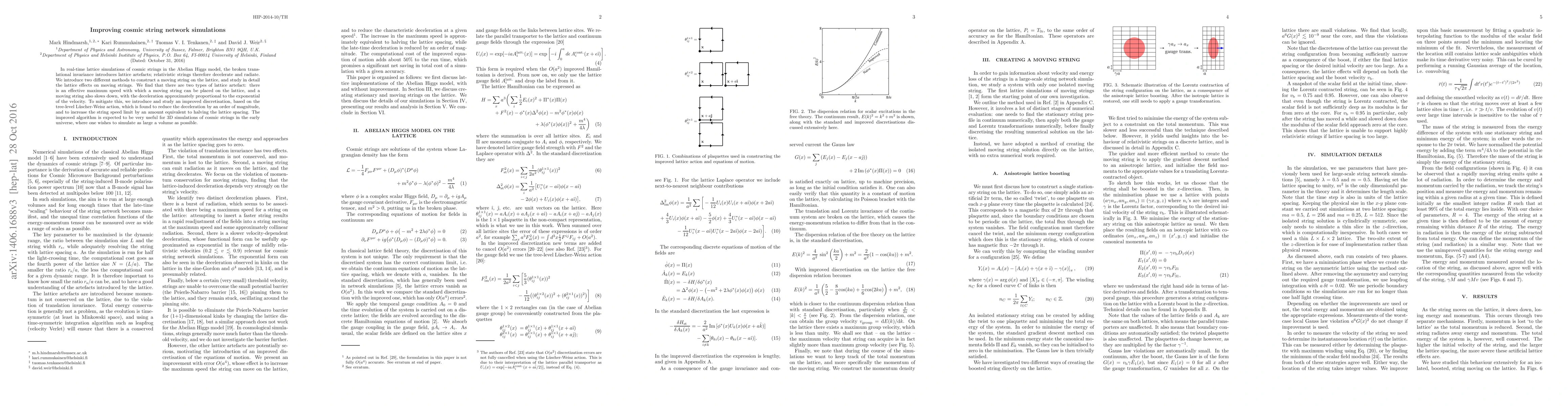 This paper introduces methods to mitigate lattice artefacts in real-time lattice simulations of cosmic strings, finding two types of artefacts: a maximum speed limit and velocity-dependent deceleration. An improved discretisation based on the Lüscher-Weisz action significantly reduces deceleration and increases the speed limit, enhancing the utility for 3D simulations of cosmic strings in the early universe.