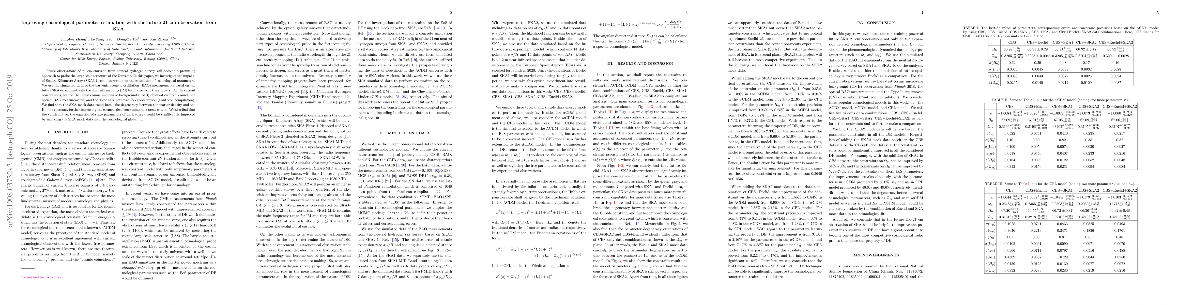 This paper explores how future 21 cm observations from the Square Kilometer Array (SKA) will enhance cosmological parameter estimation. It finds that SKA data can break degeneracies between matter density and the Hubble constant, significantly improving constraints on cosmological parameters and the equation of state for dark energy.