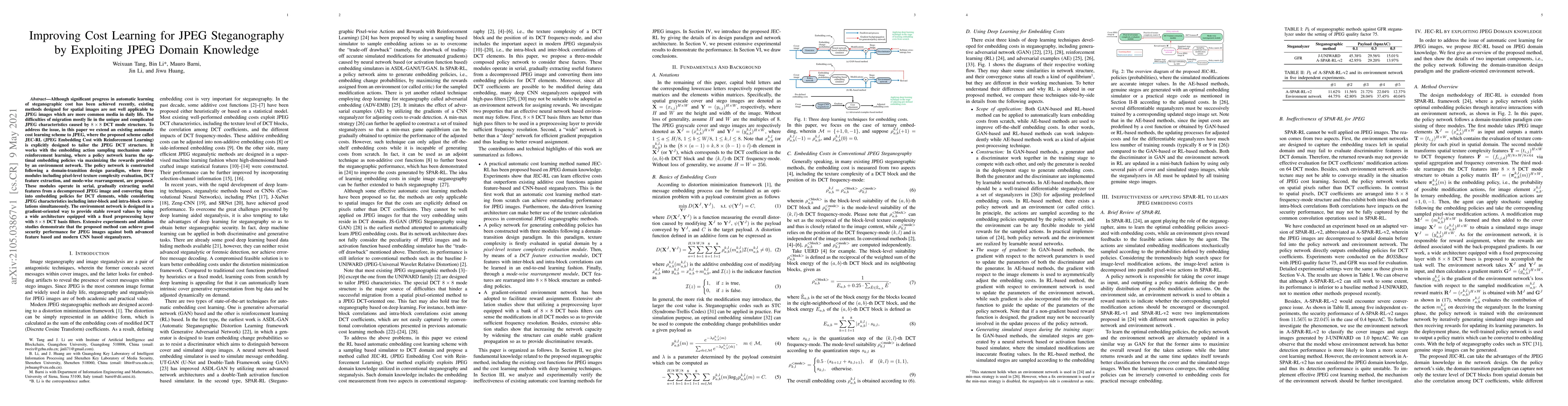 This paper proposes JEC-RL, a reinforcement learning scheme tailored for JPEG images, addressing the unique DCT structure of JPEG. It employs a policy network with modules for texture complexity, DCT feature extraction, and mode-wise rearrangement to optimize embedding policies while considering JPEG characteristics. The method achieves effective steganographic performance against advanced steganalyzers.