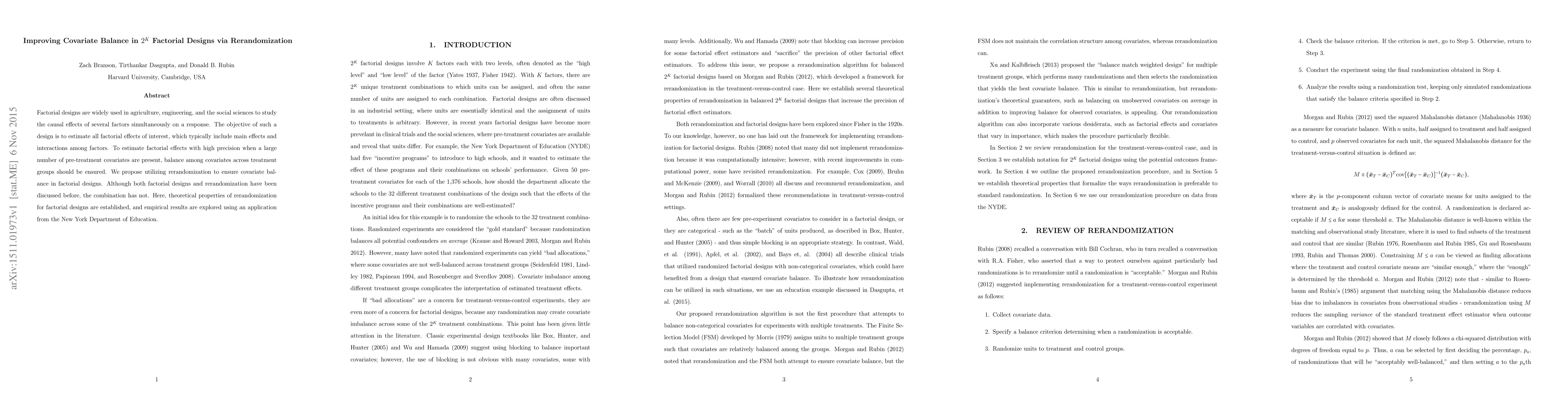 This paper proposes using rerandomization to enhance covariate balance in 2^K factorial designs, ensuring precise estimates of factorial effects amidst numerous pre-treatment covariates. The method is theoretically analyzed and empirically validated through an application in the New York Department of Education.