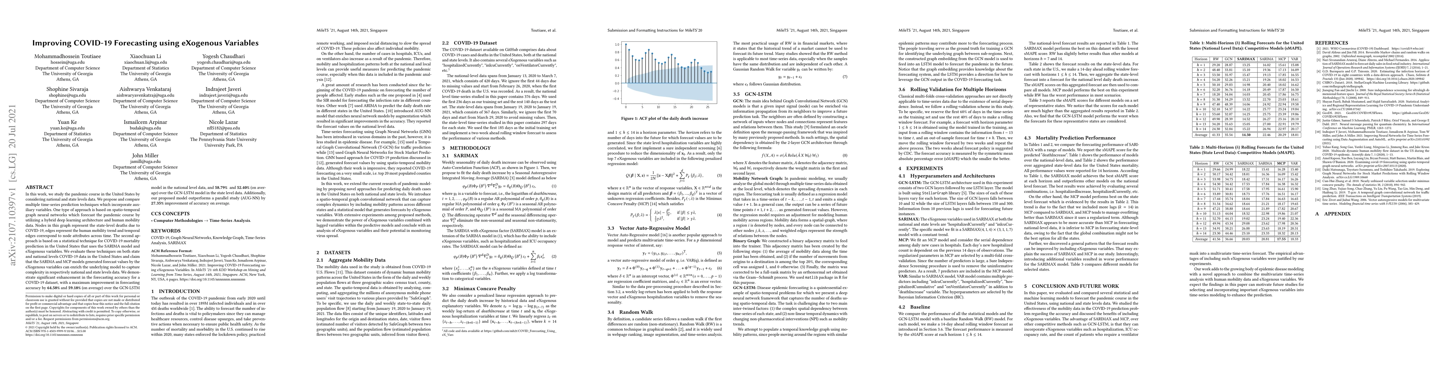 In this work, we study the pandemic course in the United States by considering national and state levels data. We propose and compare multiple time-series prediction techniques which incorporate auxiliary variables. One type of approach is based on spatio-temporal graph neural networks which forecast the pandemic course by utilizing a hybrid deep learning architecture and human mobility data. Nodes in this graph represent the state-level deaths due to COVID-19, edges represent the human mobility trend and temporal edges correspond to node attributes across time. The second approach is based on a statistical technique for COVID-19 mortality prediction in the United States that uses the SARIMA model and eXogenous variables. We evaluate these techniques on both state and national levels COVID-19 data in the United States and claim that the SARIMA and MCP models generated forecast values by the eXogenous variables can enrich the underlying model to capture complexity in respectively national and state levels data. We demonstrate significant enhancement in the forecasting accuracy for a COVID-19 dataset, with a maximum improvement in forecasting accuracy by 64.58% and 59.18% (on average) over the GCN-LSTM model in the national level data, and 58.79% and 52.40% (on average) over the GCN-LSTM model in the state level data. Additionally, our proposed model outperforms a parallel study (AUG-NN) by 27.35% improvement of accuracy on average.