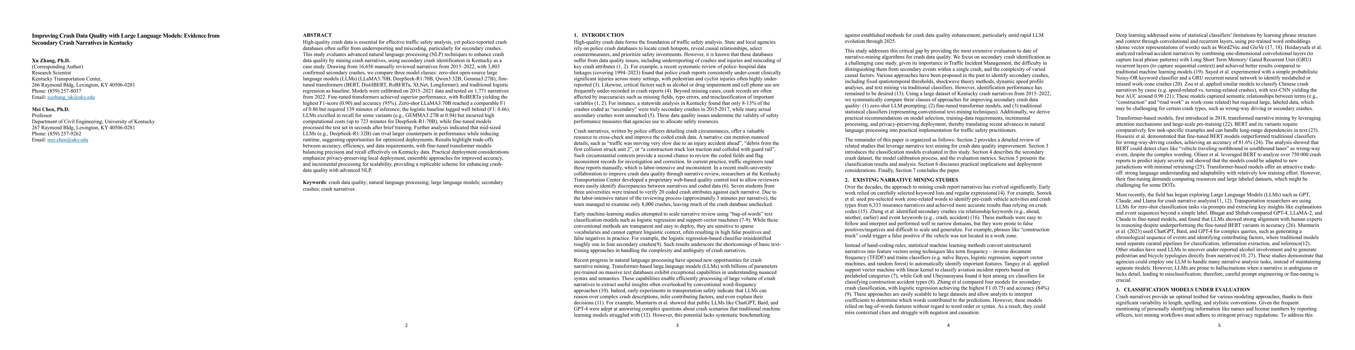 This study evaluates advanced natural language processing (NLP) techniques to enhance crash data quality by mining crash narratives, using secondary crash identification in Kentucky as a case study. Drawing from 16,656 manually reviewed narratives from 2015-2022, with 3,803 confirmed secondary crashes, we compare three model classes: zero-shot open-source large language models (LLMs) (LLaMA3:70B, DeepSeek-R1:70B, Qwen3:32B, Gemma3:27B); fine-tuned transformers (BERT, DistilBERT, RoBERTa, XLNet, Longformer); and traditional logistic regression as baseline. Models were calibrated on 2015-2021 data and tested on 1,771 narratives from 2022. Fine-tuned transformers achieved superior performance, with RoBERTa yielding the highest F1-score (0.90) and accuracy (95%). Zero-shot LLaMA3:70B reached a comparable F1 of 0.86 but required 139 minutes of inference; the logistic baseline lagged well behind (F1:0.66). LLMs excelled in recall for some variants (e.g., GEMMA3:27B at 0.94) but incurred high computational costs (up to 723 minutes for DeepSeek-R1:70B), while fine-tuned models processed the test set in seconds after brief training. Further analysis indicated that mid-sized LLMs (e.g., DeepSeek-R1:32B) can rival larger counterparts in performance while reducing runtime, suggesting opportunities for optimized deployments. Results highlight trade-offs between accuracy, efficiency, and data requirements, with fine-tuned transformer models balancing precision and recall effectively on Kentucky data. Practical deployment considerations emphasize privacy-preserving local deployment, ensemble approaches for improved accuracy, and incremental processing for scalability, providing a replicable scheme for enhancing crash-data quality with advanced NLP.