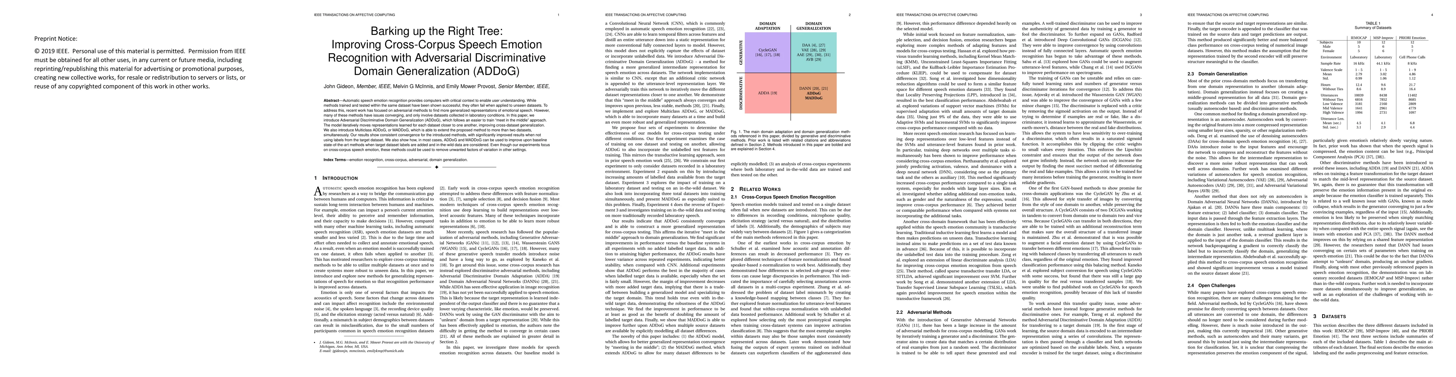 This paper introduces Adversarial Discriminative Domain Generalization (ADDoG) to improve cross-corpus speech emotion recognition, employing a "meet in the middle" training approach for better generalization across datasets. The proposed Multiclass ADDoG (MADDoG) extends this to multiple datasets, achieving consistent convergence and significantly better results without target dataset labels, even in in-the-wild conditions.