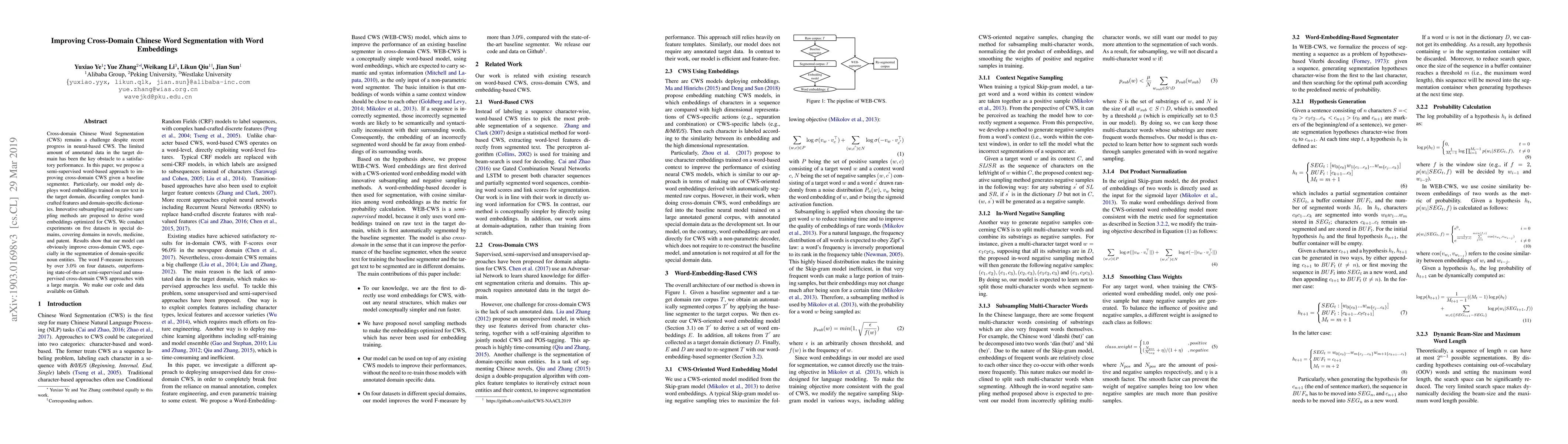This paper proposes a semi-supervised approach to enhance cross-domain Chinese Word Segmentation (CWS) using word embeddings instead of complex features. The model achieves significant improvements in CWS, particularly for domain-specific noun entities, outperforming existing methods by over 3.0% in F-measure on multiple datasets.