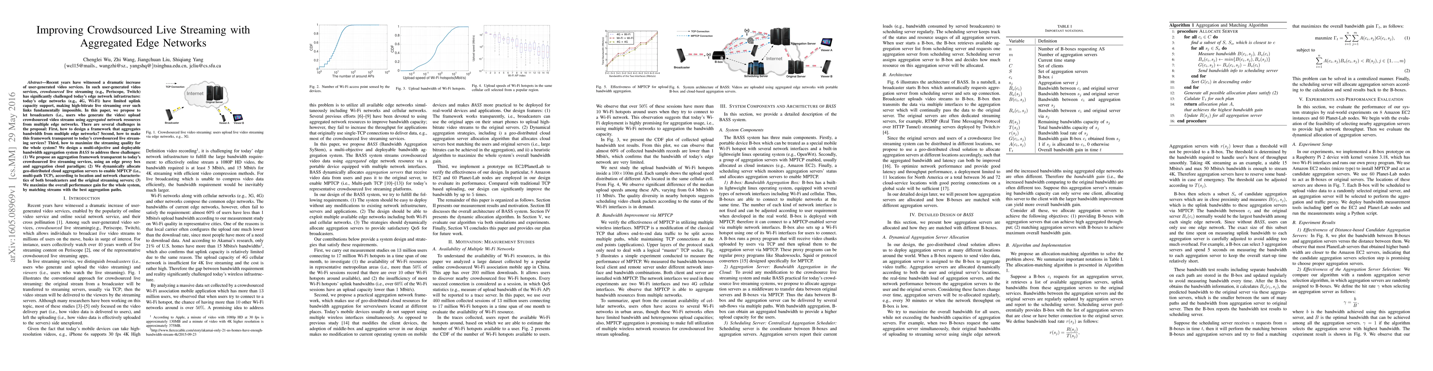 BASS, a multi-objective and deployable bandwidth aggregation system, which uses an edge proxy box and cloud aggregation paradigm to transparently aggregate bandwidth from multiple edge networks for crowdsourced live streaming services.