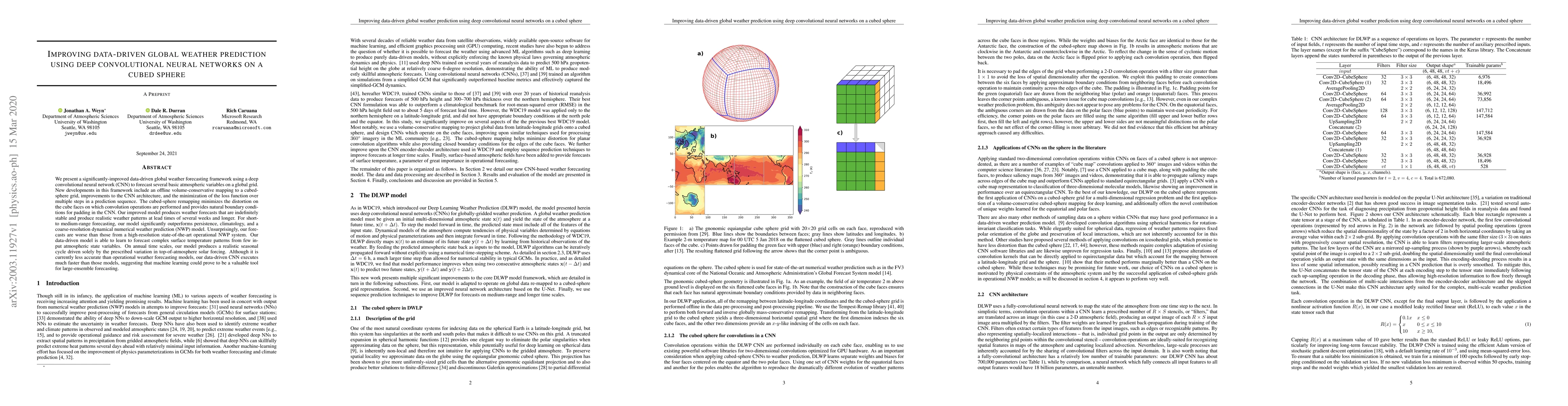 This paper introduces a deep convolutional neural network (CNN) for improved global weather prediction, utilizing a cubed-sphere grid to minimize distortion and enhance CNN performance. The model outperforms short- to medium-range forecasts against persistence and climatology, though it lags high-resolution operational models, highlighting the potential of machine learning for faster large-ensemble forecasting.