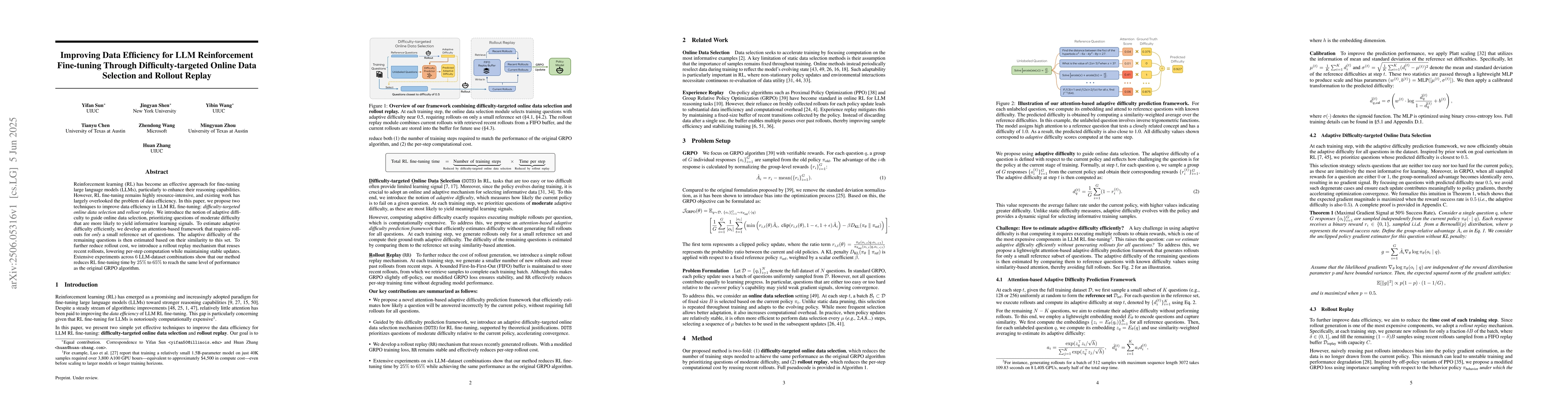 The paper proposes two techniques: difficulty-targeted online data selection and rollout replay, to enhance data efficiency in LLM RL fine-tuning. It introduces adaptive difficulty for guiding data selection and an attention-based framework for estimating this difficulty efficiently. Rollout replay is also introduced to reuse recent rollouts and reduce computation costs.