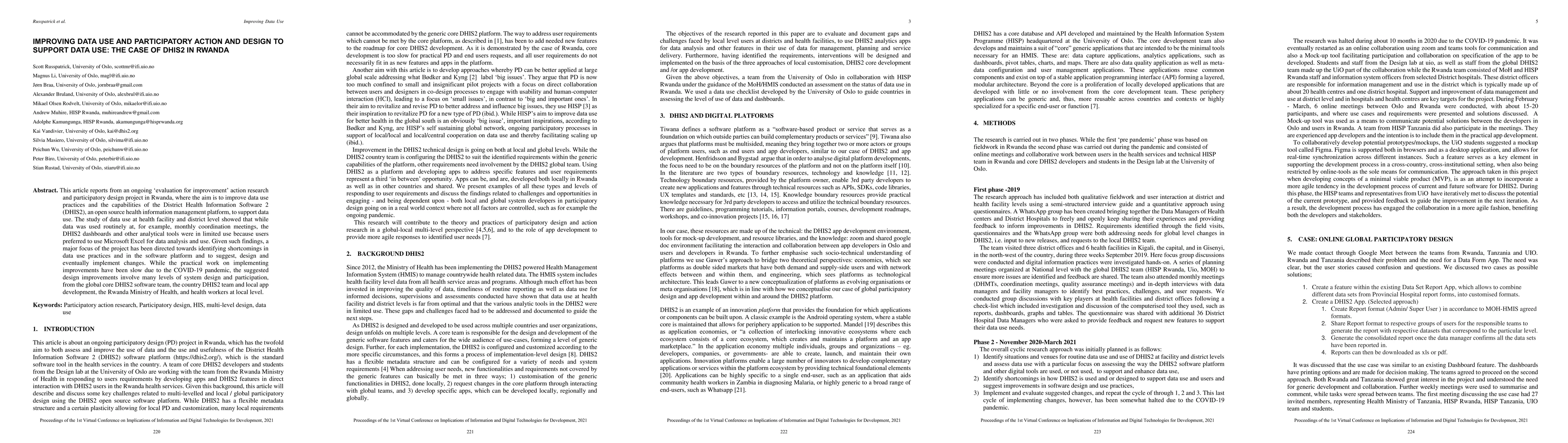 This article reports from an ongoing 'evaluation for improvement' action research and participatory design project in Rwanda, where the aim is to improve data use practices and the capabilities of the District Health Information Software 2 (DHIS2), an open source health information management platform, to support data use. The study of data use at health facility and district level showed that while data was used routinely at, for example, monthly coordination meetings, the DHIS2 dashboards and other analytical tools were in limited use because users preferred to use Microsoft Excel for data analysis and use. Given such findings, a major focus of the project has been directed towards identifying shortcomings in data use practices and in the software platform and to suggest, design and eventually implement changes. While the practical work on implementing improvements have been slow due to the COVID-19 pandemic, the suggested design improvements involve many levels of system design and participation, from the global core DHIS2 software team, the country DHIS2 team and local app development, the Rwanda Ministry of Health, and health workers at local level.