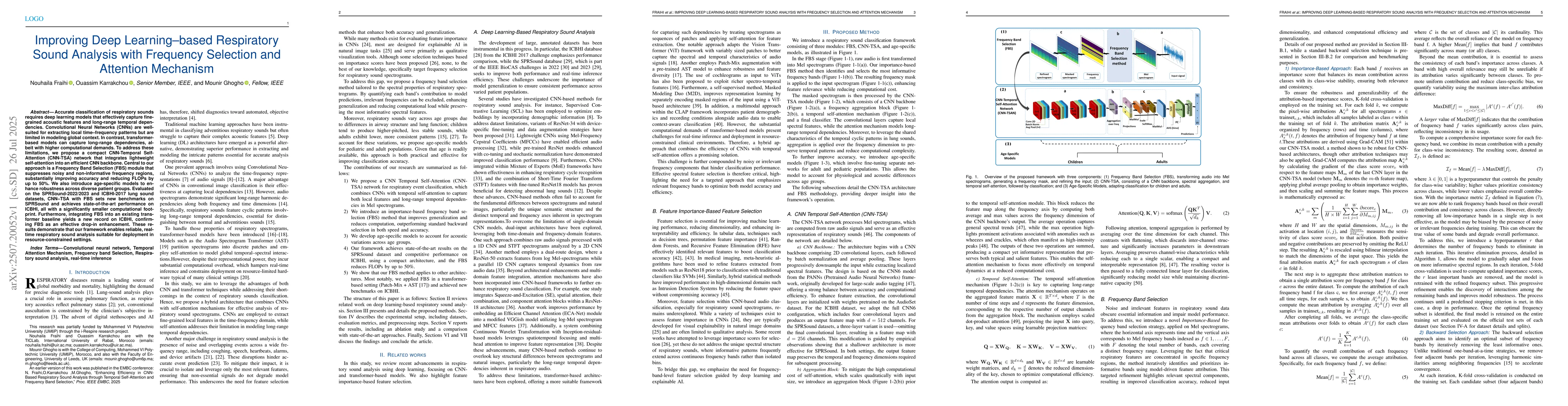 Accurate classification of respiratory sounds requires deep learning models that effectively capture fine-grained acoustic features and long-range temporal dependencies. Convolutional Neural Networks (CNNs) are well-suited for extracting local time-frequency patterns but are limited in modeling global context. In contrast, transformer-based models can capture long-range dependencies, albeit with higher computational demands. To address these limitations, we propose a compact CNN-Temporal Self-Attention (CNN-TSA) network that integrates lightweight self-attention into an efficient CNN backbone. Central to our approach is a Frequency Band Selection (FBS) module that suppresses noisy and non-informative frequency regions, substantially improving accuracy and reducing FLOPs by up to 50%. We also introduce age-specific models to enhance robustness across diverse patient groups. Evaluated on the SPRSound-2022/2023 and ICBHI-2017 lung sound datasets, CNN-TSA with FBS sets new benchmarks on SPRSound and achieves state-of-the-art performance on ICBHI, all with a significantly smaller computational footprint. Furthermore, integrating FBS into an existing transformer baseline yields a new record on ICBHI, confirming FBS as an effective drop-in enhancement. These results demonstrate that our framework enables reliable, real-time respiratory sound analysis suitable for deployment in resource-constrained settings.