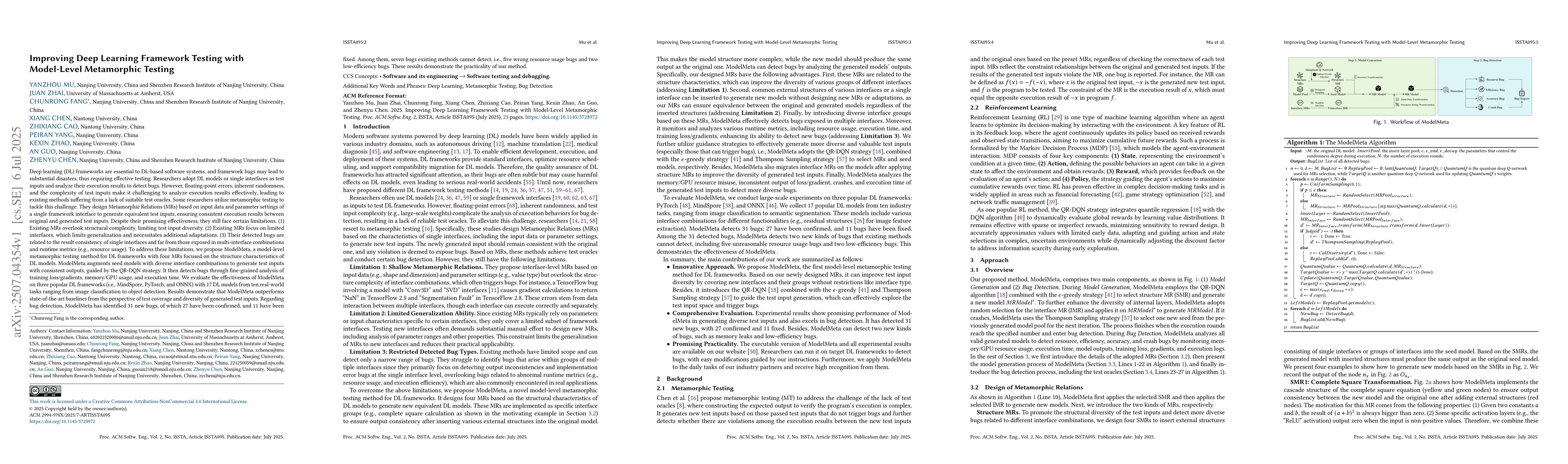 Deep learning (DL) frameworks are essential to DL-based software systems, and framework bugs may lead to substantial disasters, thus requiring effective testing. Researchers adopt DL models or single interfaces as test inputs and analyze their execution results to detect bugs. However, floating-point errors, inherent randomness, and the complexity of test inputs make it challenging to analyze execution results effectively, leading to existing methods suffering from a lack of suitable test oracles. Some researchers utilize metamorphic testing to tackle this challenge. They design Metamorphic Relations (MRs) based on input data and parameter settings of a single framework interface to generate equivalent test inputs, ensuring consistent execution results between original and generated test inputs. Despite their promising effectiveness, they still face certain limitations. (1) Existing MRs overlook structural complexity, limiting test input diversity. (2) Existing MRs focus on limited interfaces, which limits generalization and necessitates additional adaptations. (3) Their detected bugs are related to the result consistency of single interfaces and far from those exposed in multi-interface combinations and runtime metrics (e.g., resource usage). To address these limitations, we propose ModelMeta, a model-level metamorphic testing method for DL frameworks with four MRs focused on the structure characteristics of DL models. ModelMeta augments seed models with diverse interface combinations to generate test inputs with consistent outputs, guided by the QR-DQN strategy. It then detects bugs through fine-grained analysis of training loss/gradients, memory/GPU usage, and execution time.