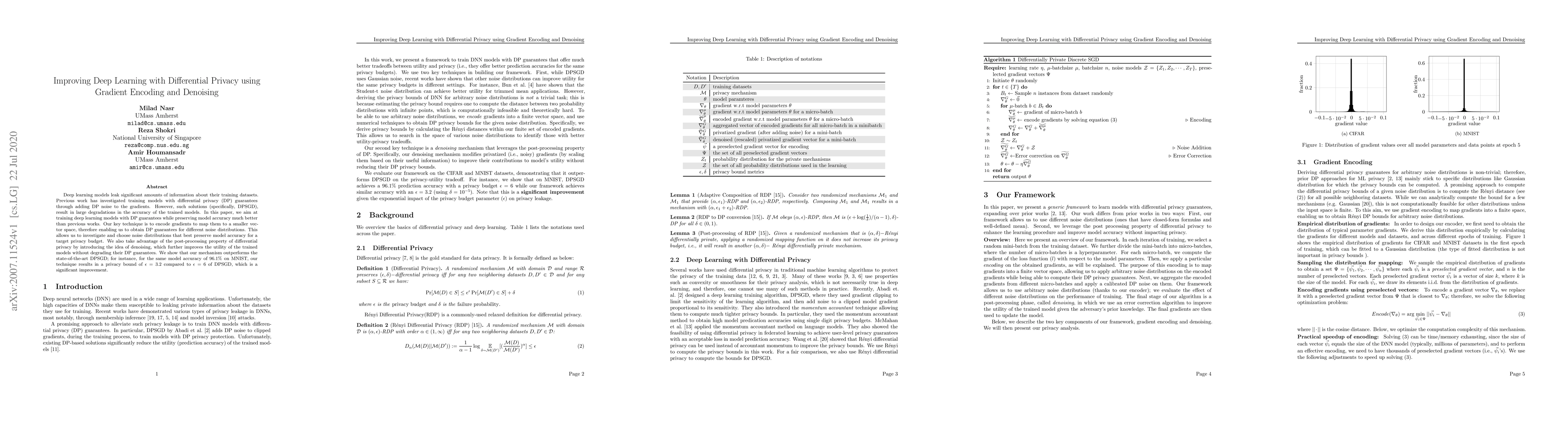 This paper proposes a novel method for training deep learning models with differential privacy that preserves model accuracy better than previous approaches. The technique involves encoding gradients to a smaller vector space and introducing denoising to enhance model utility without compromising privacy guarantees.