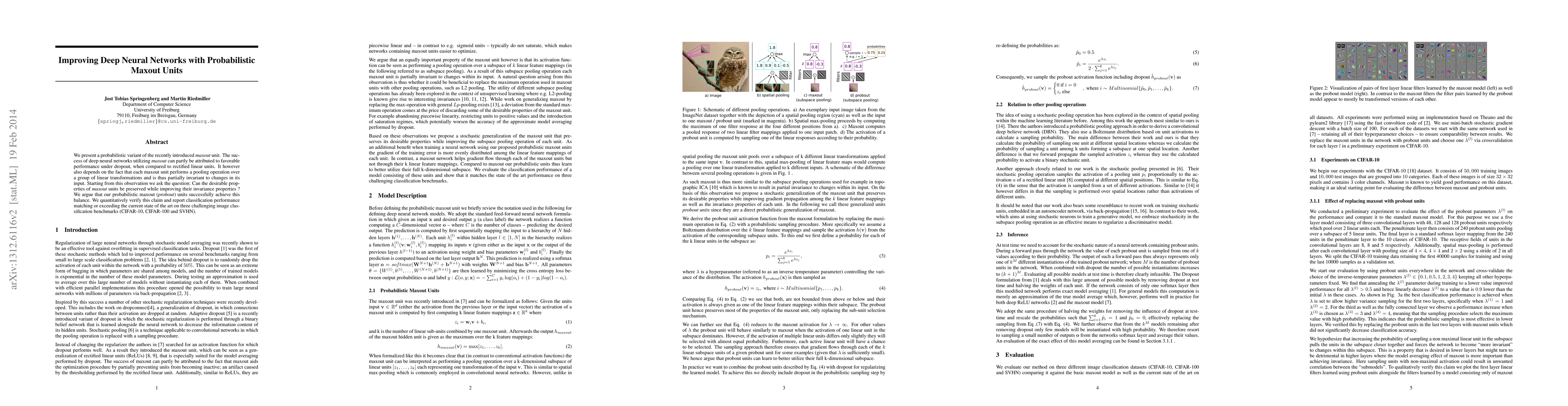 This paper introduces probabilistic maxout units (probout) that enhance the invariance properties of traditional maxout units while maintaining their performance benefits under dropout. The authors demonstrate that probout units achieve state-of-the-art classification results on CIFAR-10, CIFAR-100, and SVHN benchmarks.