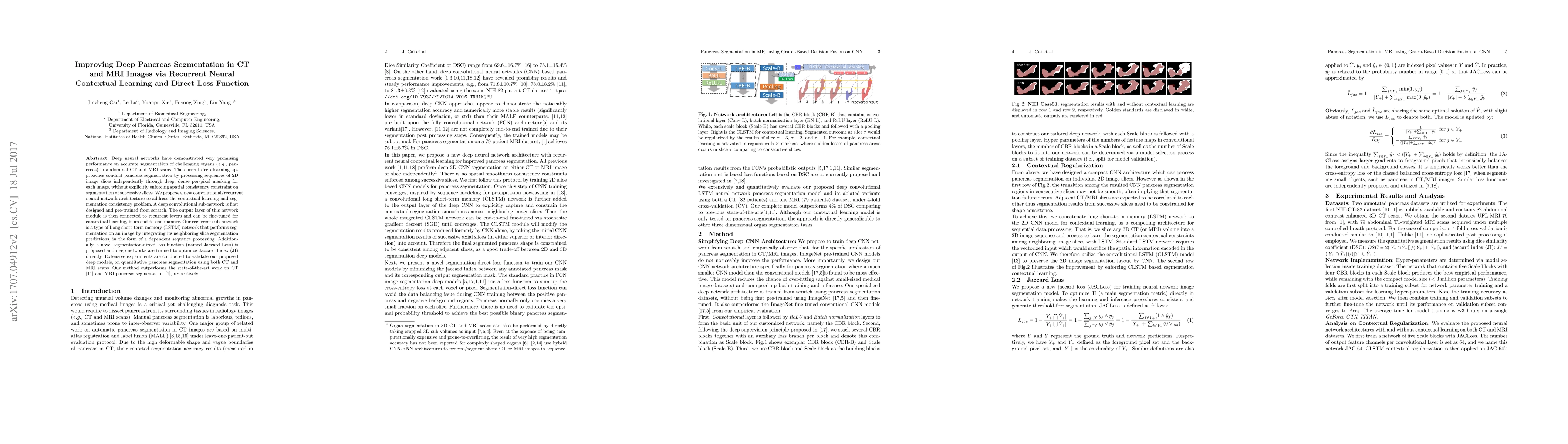 This paper proposes a novel convolutional/recurrent neural network architecture for improved pancreas segmentation in CT and MRI images, integrating contextual learning via LSTM networks and optimizing segmentation consistency through a direct Jaccard Loss function. The method outperforms existing state-of-the-art techniques on both CT and MRI scans.