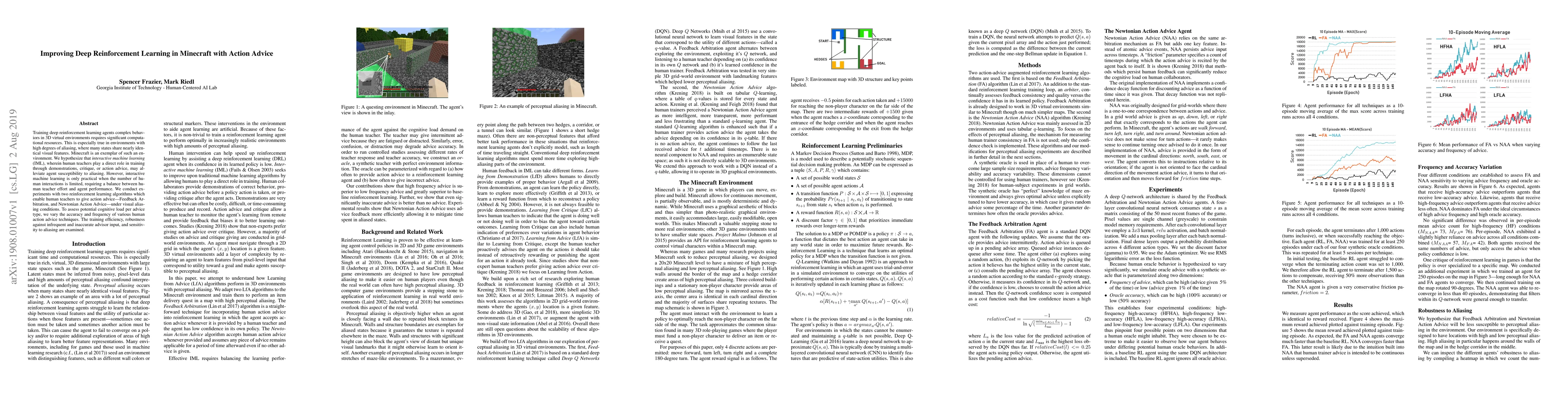 Training deep reinforcement learning agents complex behaviors in 3D virtual environments requires significant computational resources. This is especially true in environments with high degrees of aliasing, where many states share nearly identical visual features. Minecraft is an exemplar of such an environment. We hypothesize that interactive machine learning IML, wherein human teachers play a direct role in training through demonstrations, critique, or action advice, may alleviate agent susceptibility to aliasing. However, interactive machine learning is only practical when the number of human interactions is limited, requiring a balance between human teacher effort and agent performance. We conduct experiments with two reinforcement learning algorithms which enable human teachers to give action advice, Feedback Arbitration and Newtonian Action Advice, under visual aliasing conditions. To assess potential cognitive load per advice type, we vary the accuracy and frequency of various human action advice techniques. Training efficiency, robustness against infrequent and inaccurate advisor input, and sensitivity to aliasing are examined.