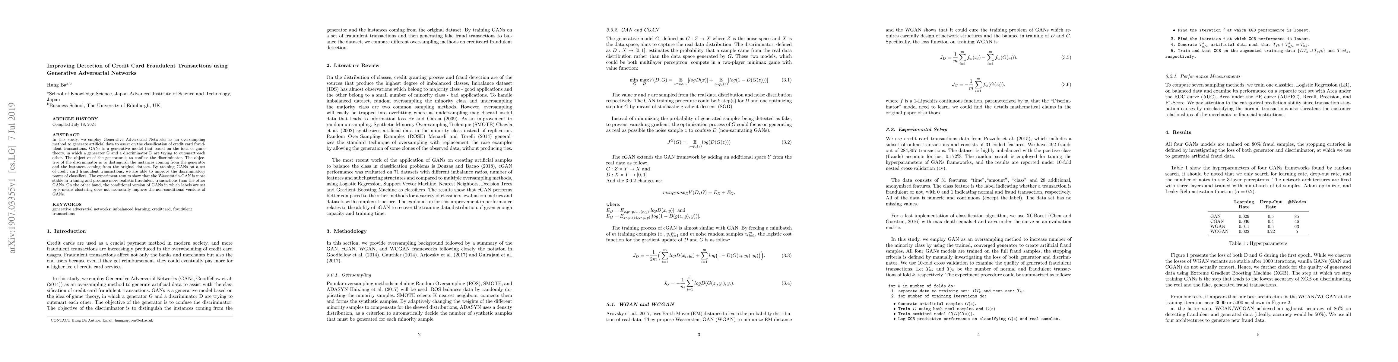In this study, we employ Generative Adversarial Networks as an oversampling method to generate artificial data to assist with the classification of credit card fraudulent transactions. GANs is a generative model based on the idea of game theory, in which a generator G and a discriminator D are trying to outsmart each other. The objective of the generator is to confuse the discriminator. The objective of the discriminator is to distinguish the instances coming from the generator and the instances coming from the original dataset. By training GANs on a set of credit card fraudulent transactions, we are able to improve the discriminatory power of classifiers. The experiment results show that the Wasserstein-GAN is more stable in training and produce more realistic fraudulent transactions than the other GANs. On the other hand, the conditional version of GANs in which labels are set by k-means clustering does not necessarily improve the non-conditional versions of GANs.