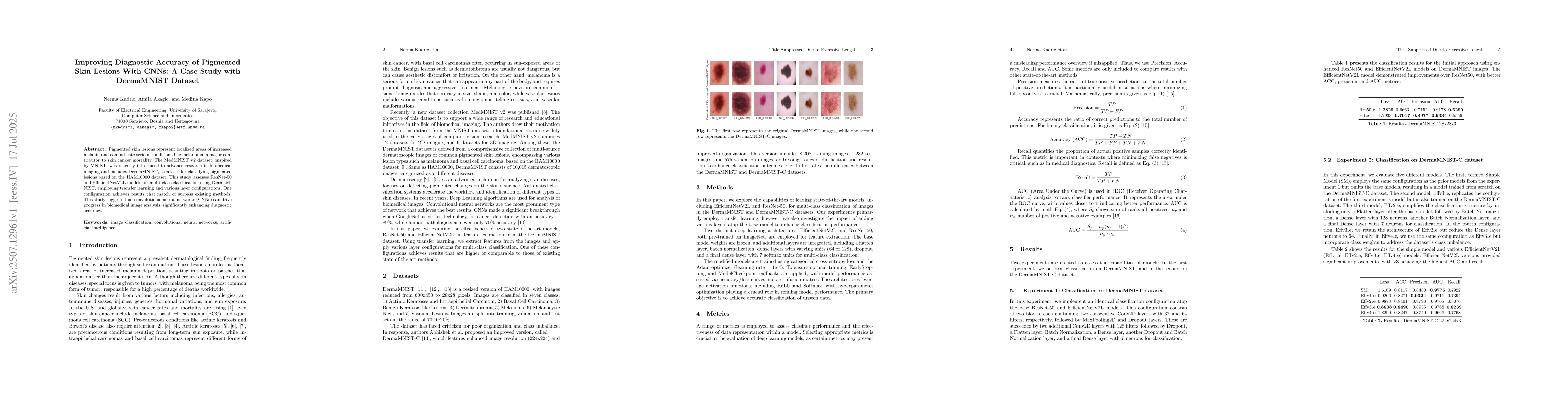 Pigmented skin lesions represent localized areas of increased melanin and can indicate serious conditions like melanoma, a major contributor to skin cancer mortality. The MedMNIST v2 dataset, inspired by MNIST, was recently introduced to advance research in biomedical imaging and includes DermaMNIST, a dataset for classifying pigmented lesions based on the HAM10000 dataset. This study assesses ResNet-50 and EfficientNetV2L models for multi-class classification using DermaMNIST, employing transfer learning and various layer configurations. One configuration achieves results that match or surpass existing methods. This study suggests that convolutional neural networks (CNNs) can drive progress in biomedical image analysis, significantly enhancing diagnostic accuracy.