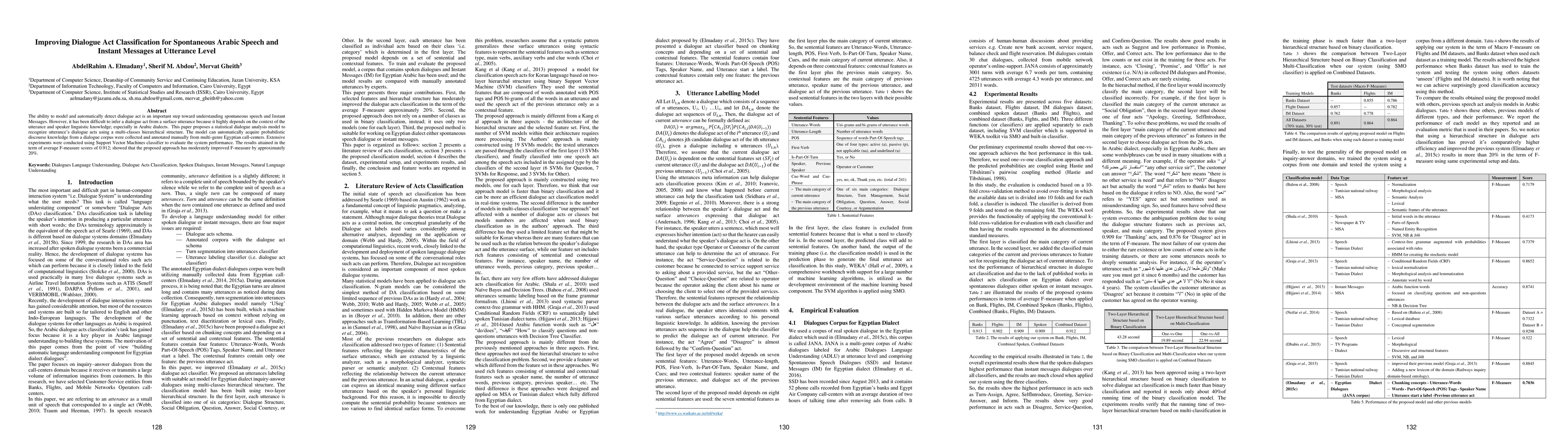 This paper proposes a statistical model for classifying dialogue acts in spontaneous Arabic speech and instant messages using a multi-classes hierarchical structure. The model, evaluated with Support Vector Machines, improved F-measure scores by about 20%, achieving an average F-measure of 0.912.