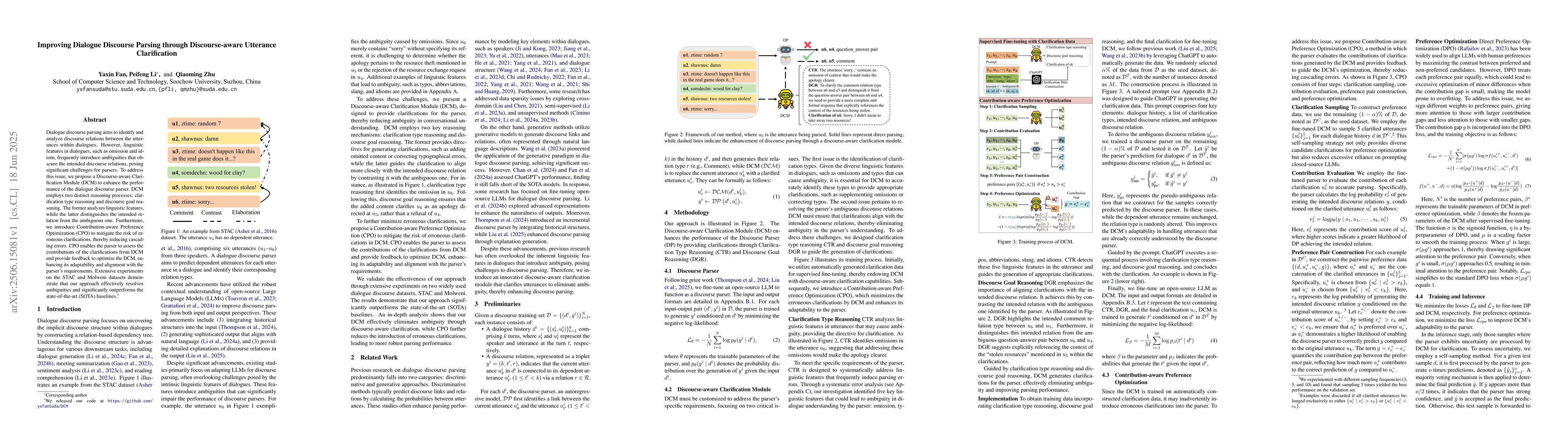 Dialogue discourse parsing aims to identify and analyze discourse relations between the utterances within dialogues. However, linguistic features in dialogues, such as omission and idiom, frequently introduce ambiguities that obscure the intended discourse relations, posing significant challenges for parsers. To address this issue, we propose a Discourse-aware Clarification Module (DCM) to enhance the performance of the dialogue discourse parser. DCM employs two distinct reasoning processes: clarification type reasoning and discourse goal reasoning. The former analyzes linguistic features, while the latter distinguishes the intended relation from the ambiguous one. Furthermore, we introduce Contribution-aware Preference Optimization (CPO) to mitigate the risk of erroneous clarifications, thereby reducing cascading errors. CPO enables the parser to assess the contributions of the clarifications from DCM and provide feedback to optimize the DCM, enhancing its adaptability and alignment with the parser's requirements. Extensive experiments on the STAC and Molweni datasets demonstrate that our approach effectively resolves ambiguities and significantly outperforms the state-of-the-art (SOTA) baselines.