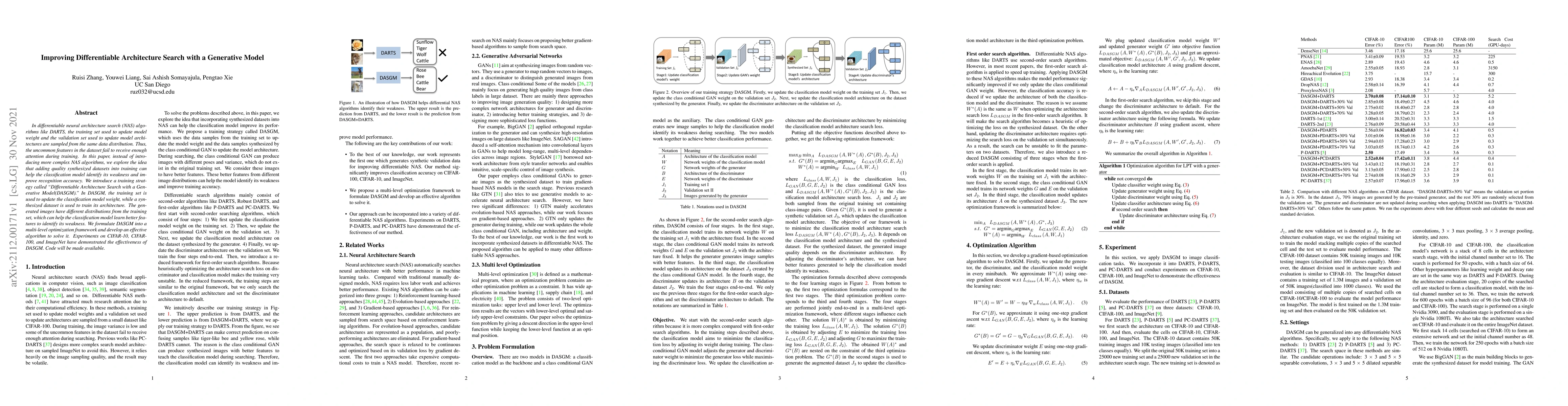 A new training strategy called Differentiable Architecture Search with a Generative Model (DASGM) improves neural architecture search accuracy by using synthesized datasets to identify model weaknesses, leading to better recognition performance on CIFAR-10, CIFAR-100, and ImageNet.