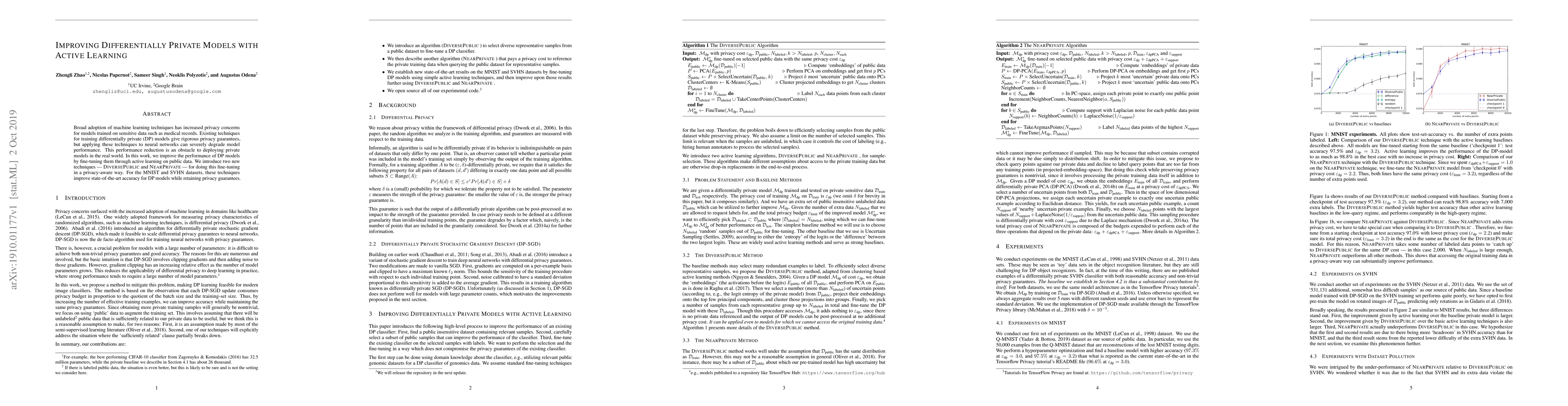 This paper proposes new techniques, DIVERSEPUBLIC and NEARPRIVATE, to enhance the performance of differentially private neural networks through active learning on public data, achieving better accuracy on MNIST and SVHN datasets while maintaining privacy guarantees.