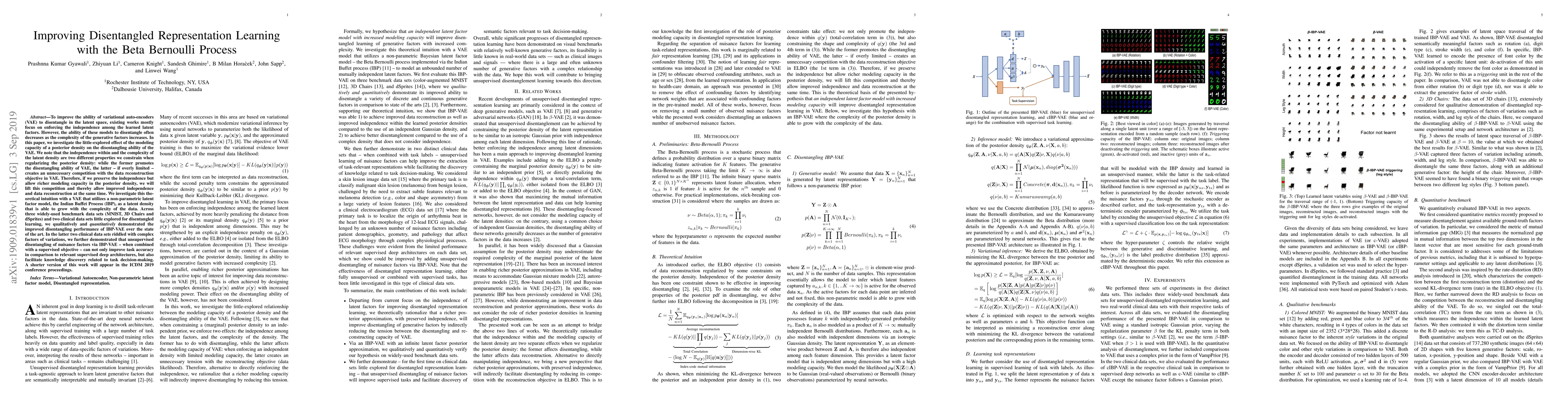 This paper proposes improving Variational Autoencoder (VAE) disentanglement by allowing richer modeling capacity in the posterior density, using the Indian Buffet Process (IBP). Results show that IBP-VAE outperforms existing methods in disentangling abilities across benchmarks and clinical datasets, enhancing both data reconstruction and task accuracy in complex variations.