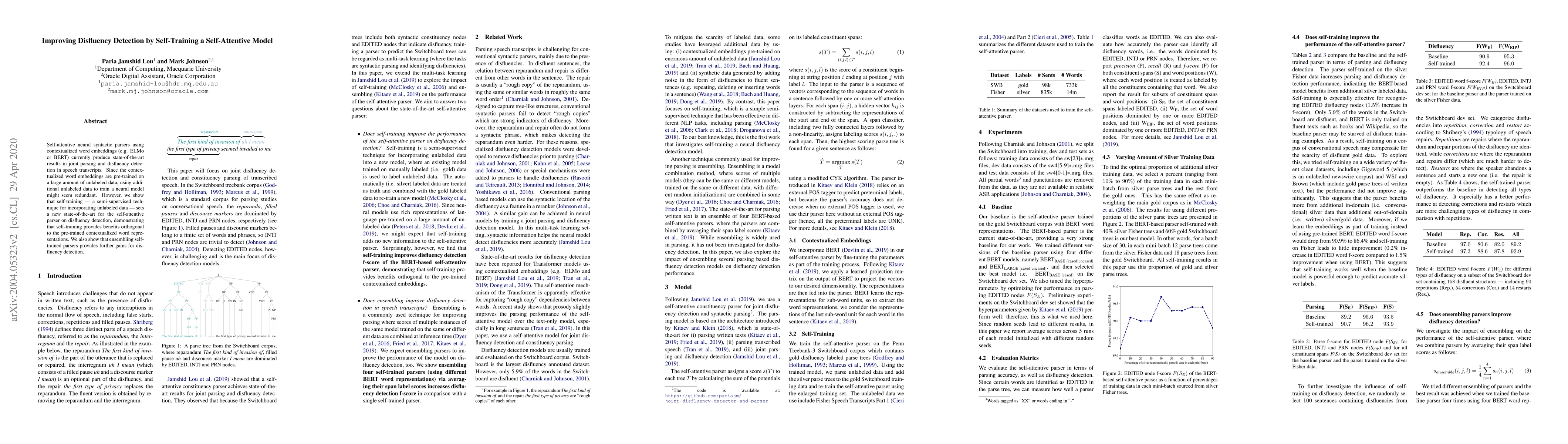 This paper demonstrates that self-training a self-attentive neural syntactic parser enhances disfluency detection performance, even when pre-trained embeddings are already highly effective. The study finds that incorporating unlabeled data through self-training provides additional benefits, and ensemble methods further improve detection accuracy.