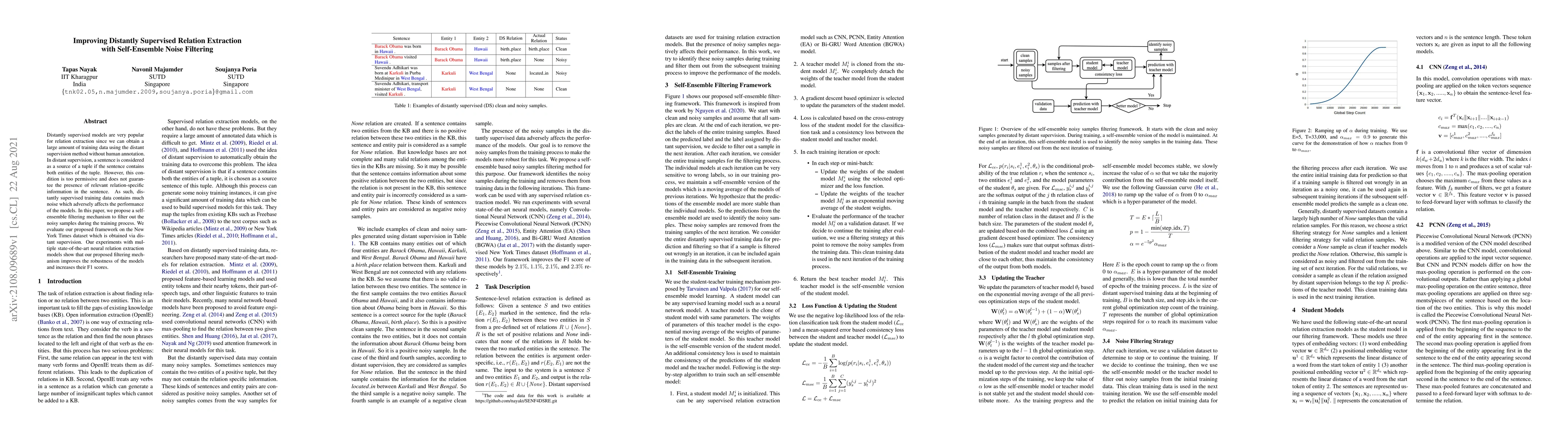 This paper proposes a self-ensemble noise filtering mechanism to enhance distantly supervised relation extraction models by removing noisy training samples. Experiments on the New York Times dataset show improved model robustness and higher F1 scores.