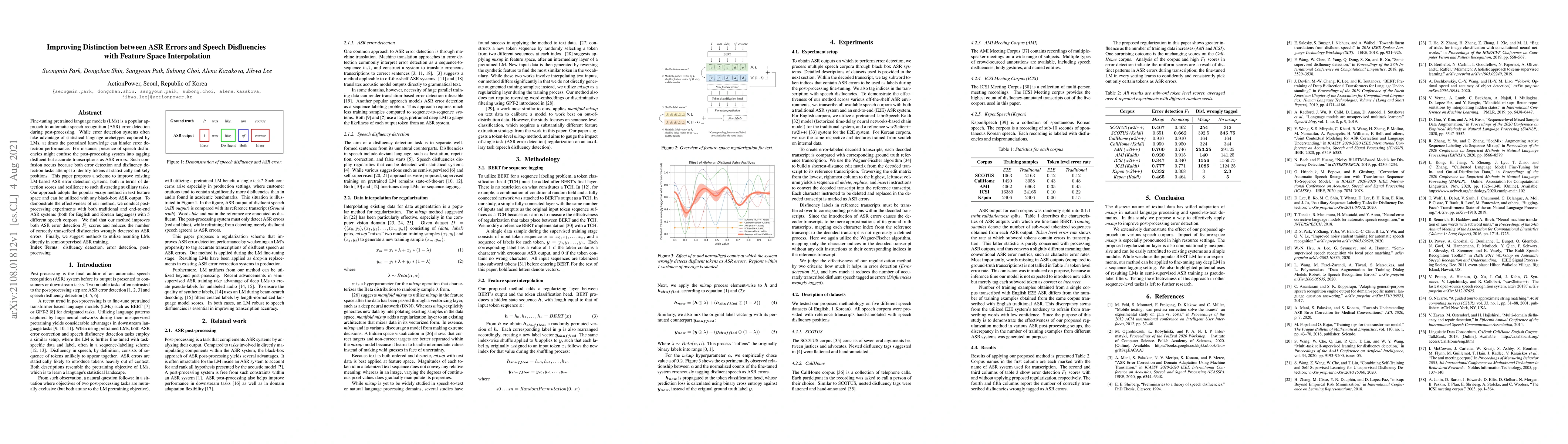 Fine-tuning pretrained language models (LMs) is a popular approach to automatic speech recognition (ASR) error detection during post-processing. While error detection systems often take advantage of statistical language archetypes captured by LMs, at times the pretrained knowledge can hinder error detection performance. For instance, presence of speech disfluencies might confuse the post-processing system into tagging disfluent but accurate transcriptions as ASR errors. Such confusion occurs because both error detection and disfluency detection tasks attempt to identify tokens at statistically unlikely positions. This paper proposes a scheme to improve existing LM-based ASR error detection systems, both in terms of detection scores and resilience to such distracting auxiliary tasks. Our approach adopts the popular mixup method in text feature space and can be utilized with any black-box ASR output. To demonstrate the effectiveness of our method, we conduct post-processing experiments with both traditional and end-to-end ASR systems (both for English and Korean languages) with 5 different speech corpora. We find that our method improves both ASR error detection F 1 scores and reduces the number of correctly transcribed disfluencies wrongly detected as ASR errors. Finally, we suggest methods to utilize resulting LMs directly in semi-supervised ASR training.