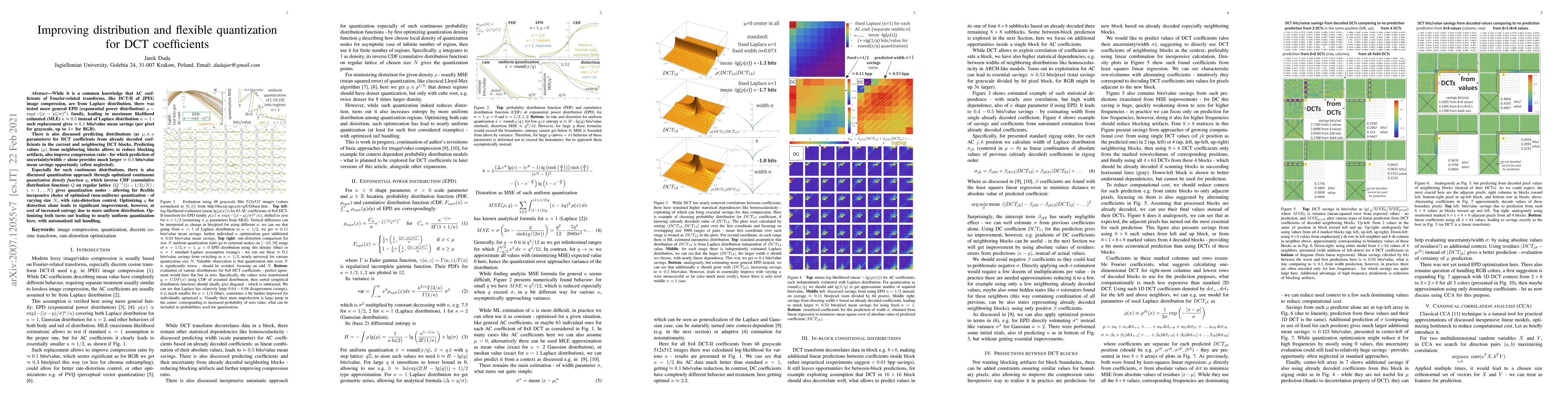 While it is a common knowledge that AC coefficients of Fourier-related transforms, like DCT-II of JPEG image compression, are from Laplace distribution, there was tested more general EPD (exponential power distribution) $\rho\sim \exp(-(|x-\mu|/\sigma)^{\kappa})$ family, leading to maximum likelihood estimated (MLE) $\kappa\approx 0.5$ instead of Laplace distribution $\kappa=1$ - such replacement gives $\approx 0.1$ bits/value mean savings (per pixel for grayscale, up to $3\times$ for RGB). There is also discussed predicting distributions (as $\mu, \sigma, \kappa$ parameters) for DCT coefficients from already decoded coefficients in the current and neighboring DCT blocks. Predicting values $(\mu)$ from neighboring blocks allows to reduce blocking artifacts, also improve compression ratio - for which prediction of uncertainty/width $\sigma$ alone provides much larger $\approx 0.5$ bits/value mean savings opportunity (often neglected). Especially for such continuous distributions, there is also discussed quantization approach through optimized continuous \emph{quantization density function} $q$, which inverse CDF (cumulative distribution function) $Q$ on regular lattice $\{Q^{-1}((i-1/2)/N):i=1\ldots N\}$ gives quantization nodes - allowing for flexible inexpensive choice of optimized (non-uniform) quantization - of varying size $N$, with rate-distortion control. Optimizing $q$ for distortion alone leads to significant improvement, however, at cost of increased entropy due to more uniform distribution. Optimizing both turns out leading to nearly uniform quantization here, with automatized tail handling.