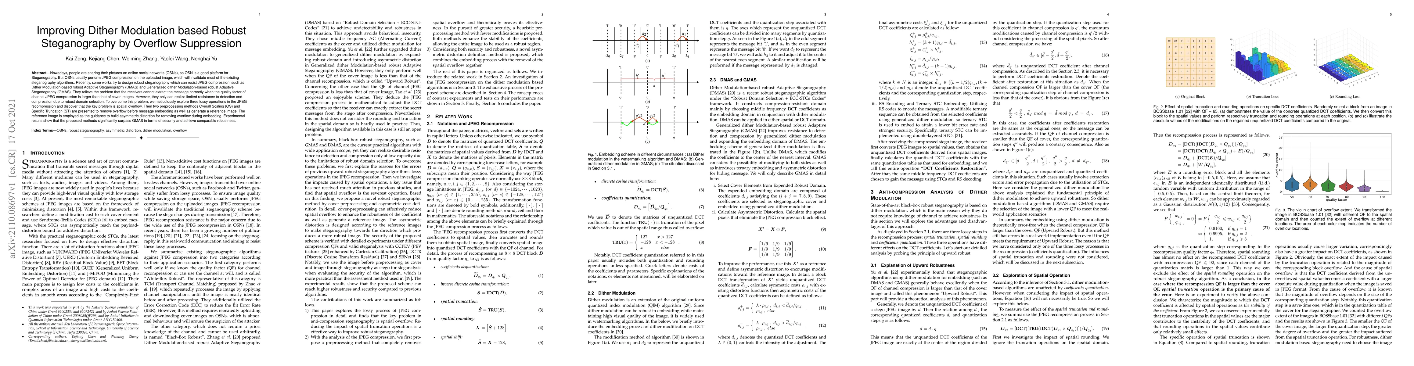 This paper proposes new preprocessing methods, Overall Scaling (OS) and Specific Truncation (ST), to suppress overflow in JPEG images, enhancing the robustness of Dither Modulation-based Steganography against JPEG compression. The methods improve security while maintaining comparable robustness compared to existing algorithms.