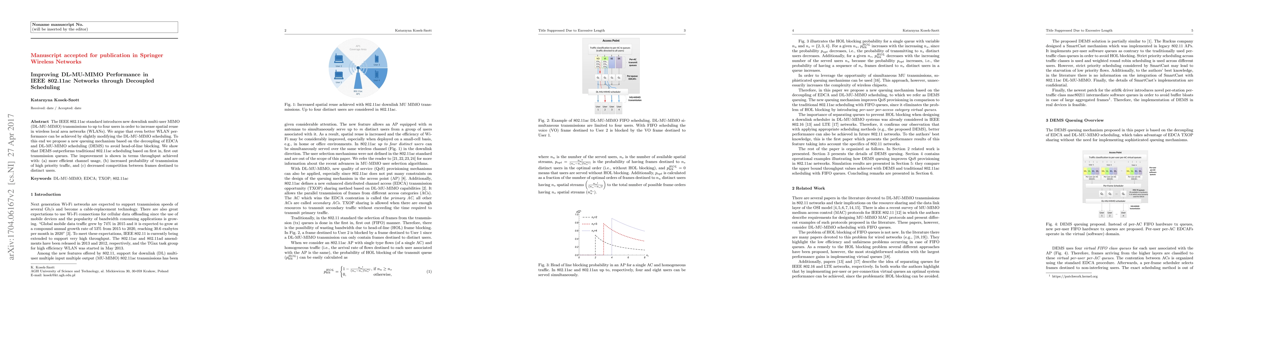 This paper proposes a new queuing mechanism called DEMS to enhance DL-MU-MIMO performance in IEEE 802.11ac networks by decoupling EDCA and DL-MU-MIMO scheduling, which improves throughput through better channel usage, higher priority traffic transmission, and reduced competition between user frames. DEMS outperforms traditional scheduling methods.