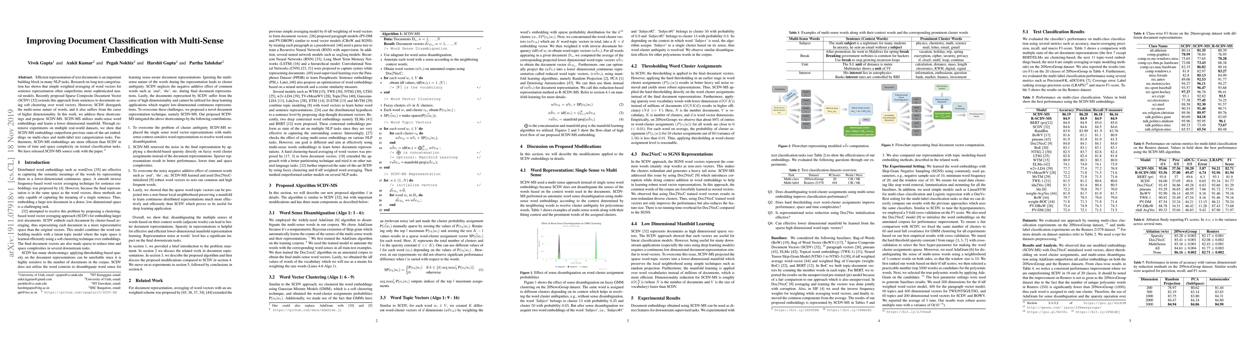 This paper proposes SCDV-MS, an improved method for document classification that uses multi-sense word embeddings and a lower dimensional manifold to overcome the limitations of previous models like SCDV. Experimental results show SCDV-MS outperforms prior methods in both accuracy and efficiency for multi-class and multi-label text categorization tasks.