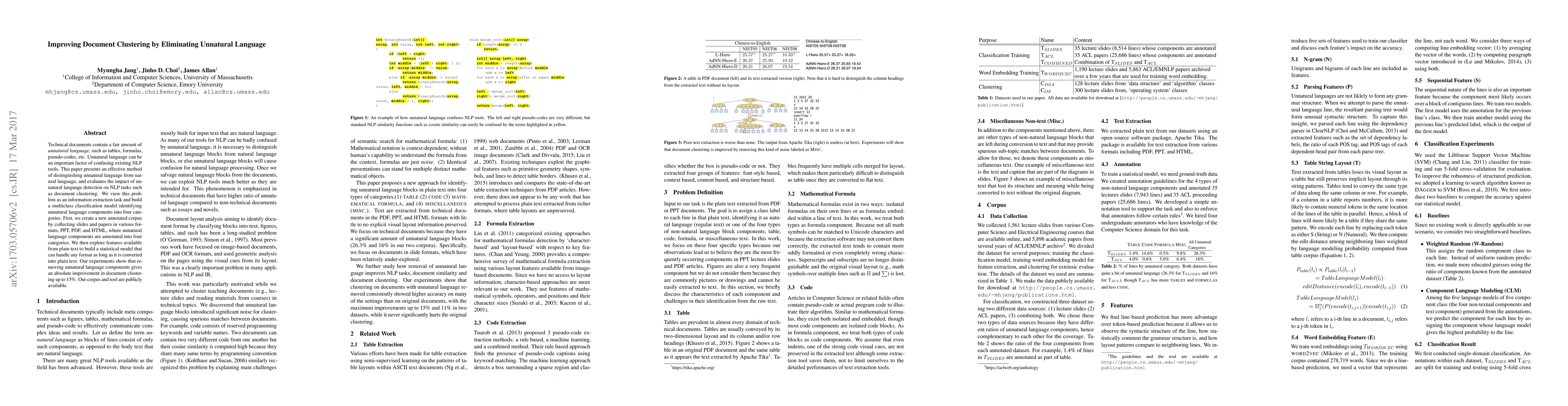 This paper proposes a method to distinguish and eliminate unnatural language from technical documents to improve document clustering. By creating a new annotated corpus and developing a multiclass classification model, the authors demonstrate a 15% improvement in clustering accuracy when unnatural language is removed.