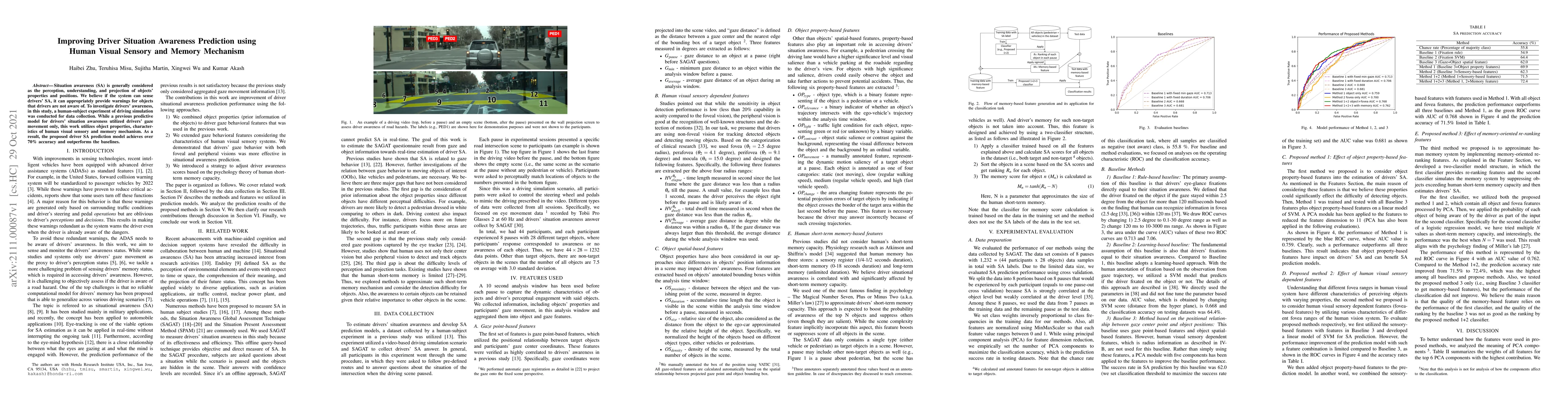 This study enhances driver situation awareness prediction by incorporating object properties and human visual and memory mechanisms, achieving over 70% accuracy in a driving simulation experiment, surpassing previous models that relied solely on gaze movement.