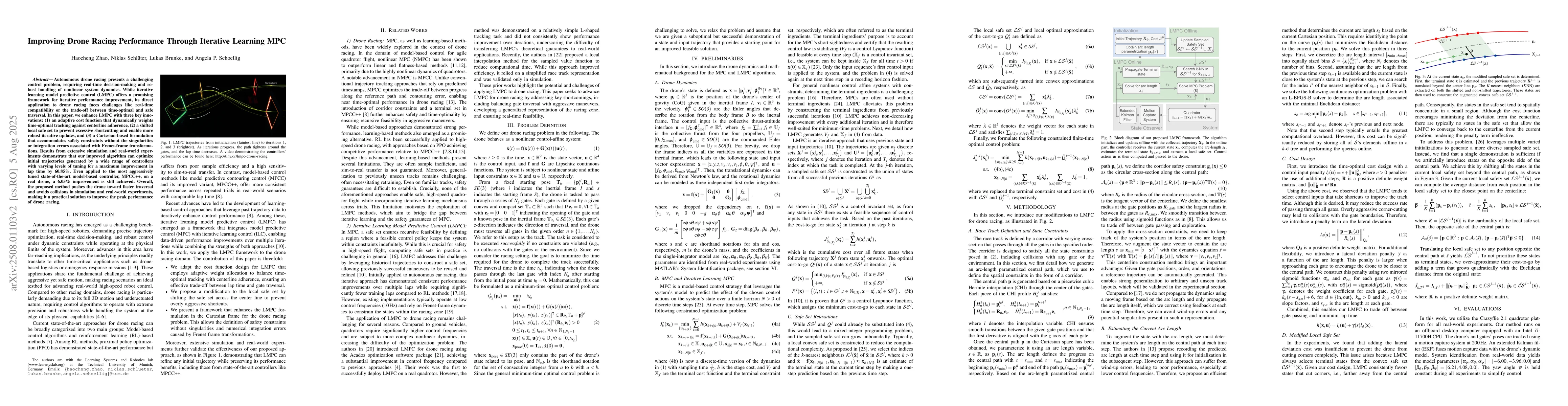 Autonomous drone racing presents a challenging control problem, requiring real-time decision-making and robust handling of nonlinear system dynamics. While iterative learning model predictive control (LMPC) offers a promising framework for iterative performance improvement, its direct application to drone racing faces challenges like real-time compatibility or the trade-off between time-optimal and safe traversal. In this paper, we enhance LMPC with three key innovations: (1) an adaptive cost function that dynamically weights time-optimal tracking against centerline adherence, (2) a shifted local safe set to prevent excessive shortcutting and enable more robust iterative updates, and (3) a Cartesian-based formulation that accommodates safety constraints without the singularities or integration errors associated with Frenet-frame transformations. Results from extensive simulation and real-world experiments demonstrate that our improved algorithm can optimize initial trajectories generated by a wide range of controllers with varying levels of tuning for a maximum improvement in lap time by 60.85%. Even applied to the most aggressively tuned state-of-the-art model-based controller, MPCC++, on a real drone, a 6.05% improvement is still achieved. Overall, the proposed method pushes the drone toward faster traversal and avoids collisions in simulation and real-world experiments, making it a practical solution to improve the peak performance of drone racing.