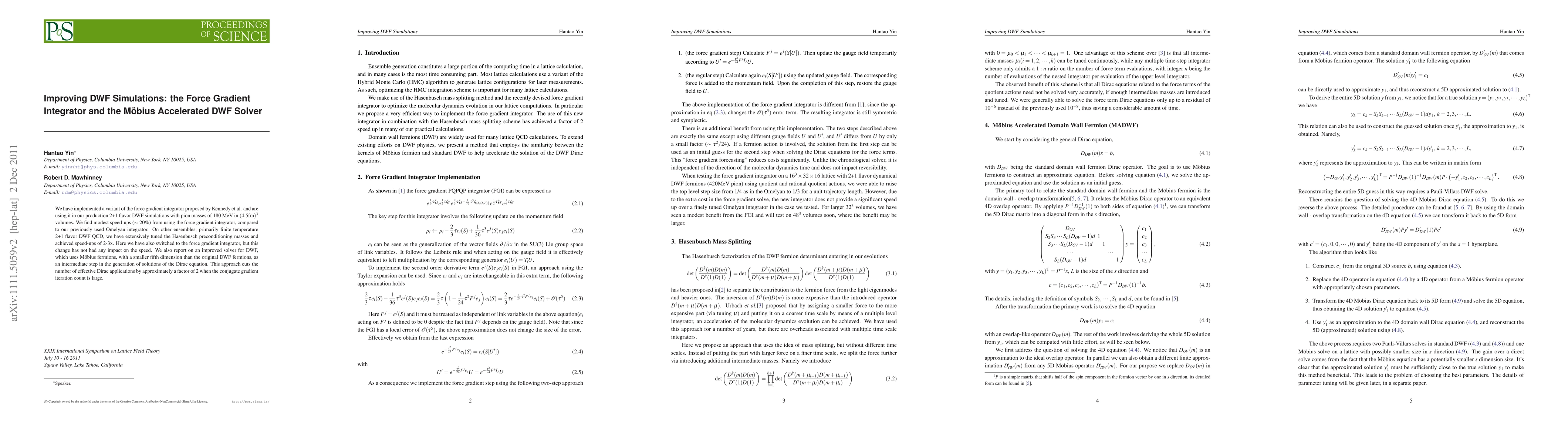 This paper introduces a force gradient integrator and an improved M\"obius accelerated DWF solver for lattice QCD simulations. The force gradient integrator provides modest speed-ups (\~20%) in 2+1 flavor DWF simulations but has no effect on finite temperature ensembles. The new DWF solver using M\"obius fermions reduces the number of Dirac applications by half during large conjugate gradient iterations.