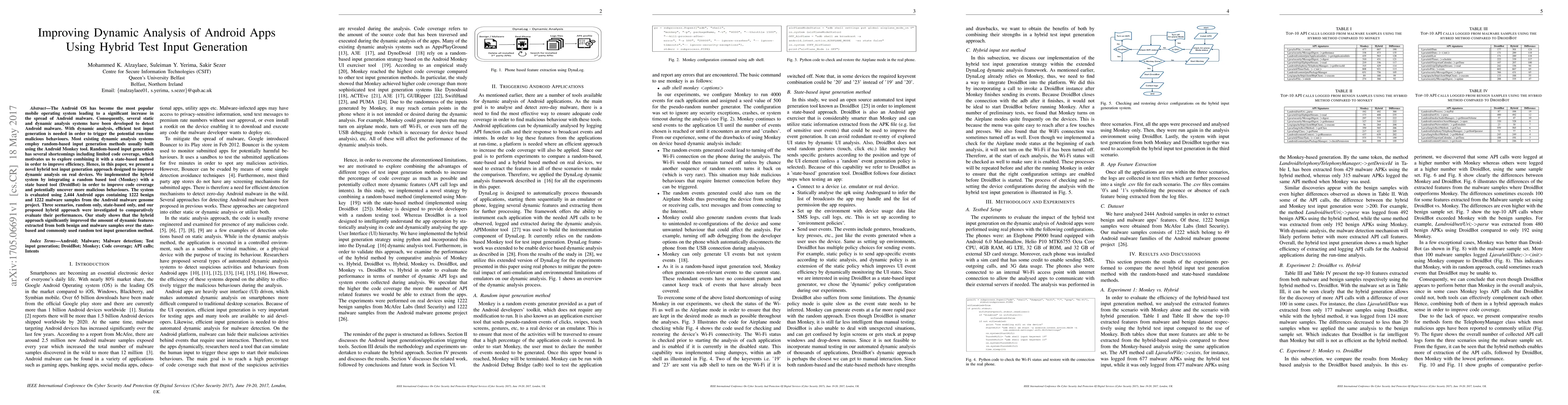 This paper proposes a hybrid test input generation approach combining random and state-based methods to enhance dynamic analysis for Android apps. The hybrid system, integrating Monkey and DroidBot, significantly improves code coverage and uncovers more malicious behaviors compared to random-based or state-based methods alone, as demonstrated through testing on 2,444 Android apps.