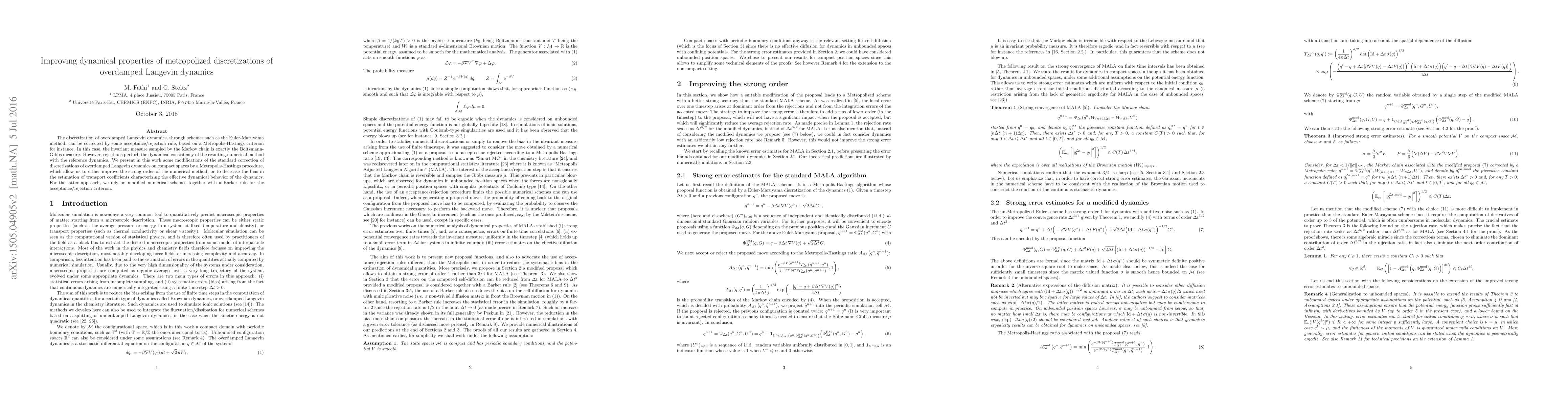This paper proposes modifications to the discretization of overdamped Langevin dynamics using a Metropolis-Hastings correction to improve the strong order or reduce bias in transport coefficient estimation. It introduces new numerical schemes and a Barker rule to enhance dynamical properties.