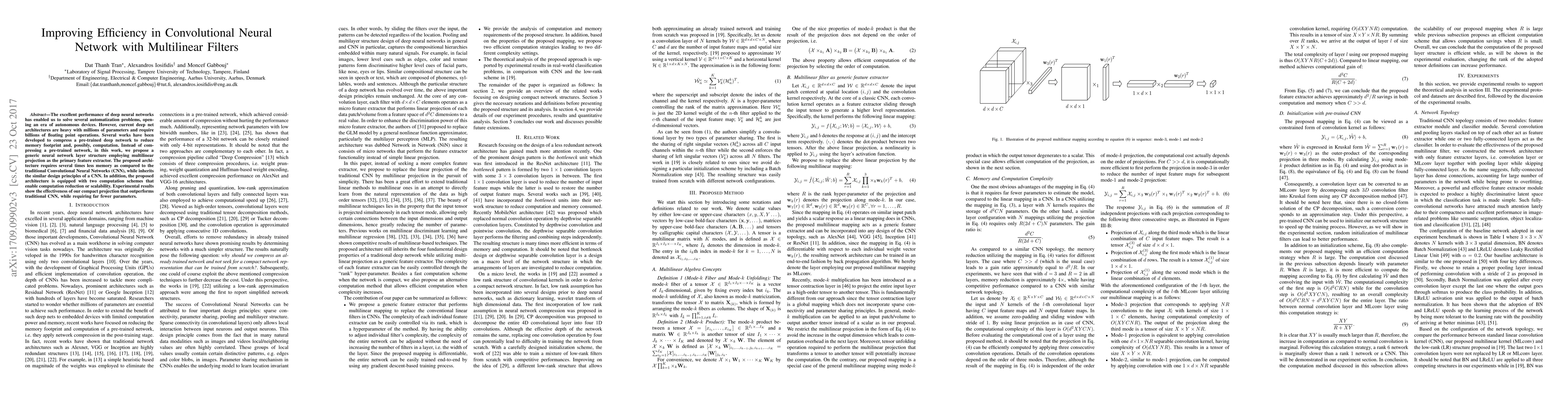 This paper proposes a neural network layer structure with multilinear filters that requires fewer memory and computation than traditional Convolutional Neural Networks, achieving similar performance while being more efficient.